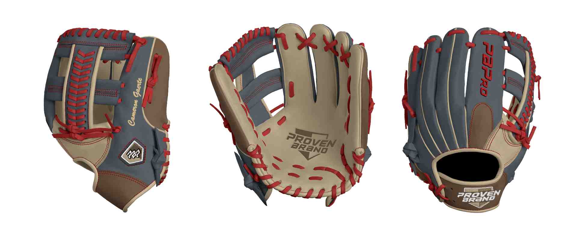 Category: PBPro Custom Product: Baseball Series: Pro Grade Series | USD 219.00 Glove Type: Fielders Size: 11.5 Finger Pad: With Finger Pad Web: X-Laced Single Post Web Palm: Palm (Color: Cream) Back Shell Main: Back Shell Main (Color: Steel Gray) Back Shell Accent: Back Shell Accent (Color: Dark Brown) Web: Web (Color: Steel Gray) Finger Pad: Finger Pad (Color: Dark Brown) Welting: Welting (Color: Cream) Binding: Binding (Color: Cream) Lace: Lace (Color: Red) Logo and Label-puffed: Logo and Label-puffed (Color: Cream) Stitch: Stitch (Color: Red) Embroidery: Embroidery (Color: Red) Hand Throw: Right Hand Thrower Lace Length: Normal Flex (will not show in customizer): Standard Flex: ( Ideal for Youth Player. Glove still needs to break in) Wrist Opening (will not show in customizer): Standard Wrist Name: Cameron Gaerte (Font Style: Brush Script MT, Font Color: Cream, Patch Color: N/A) Flag (Ring Finger): N/A Remarks: N/A