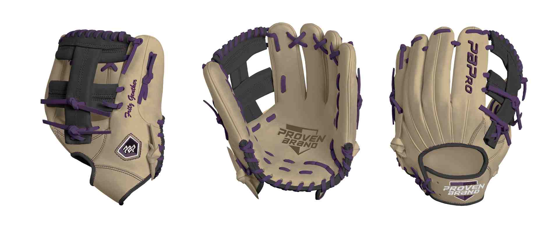 Category: PBPro Custom Product: Baseball Series: Pro Order Series | USD 319.00 Glove Type: Fielders Size: 11.5" Finger Pad: Without Finger Pad Web: New Cross Web Palm: Palm (Color: Cream) Back Shell Main: Plain Leather (Color: Cream) Back Shell Accent: Plain Leather (Color: Cream) Web: Web (Color: Black) Welting: Welting (Color: Cream) Binding: Binding (Color: Black) Lace: Lace (Color: Hot Purple (#3B1A53)) Logo and Label-puffed: Logo and Label-puffed (Color: Purple) Stitch: Stitch (Color: Purple) Embroidery: Embroidery (Color: Purple) Hand Throw: Right Hand Thrower Lace Length: Long (will not show in customizer) Flex (will not show in customizer): Pro Flex: (Ideal for Pro Player who wants to have more control in forming the glove) Name: Fritz Genther (Font Style: Brush Script MT, Font Color: Purple, Patch Color: N/A) Flag (Ring Finger): N/A Remarks: N/A
