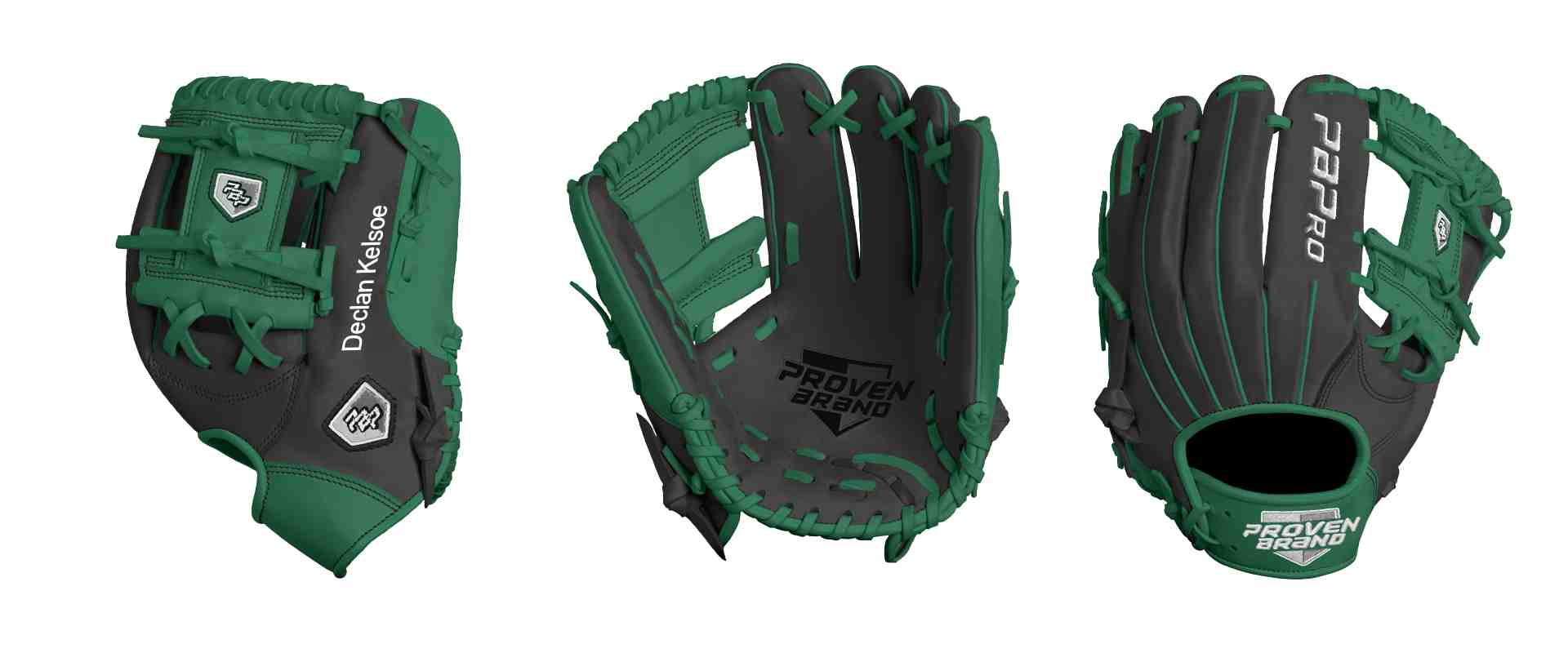 Category: PBPro Custom Product: Baseball Series: Travel Pro Series | USD 159.00 Glove Type: Fielders Size: 11.5" Finger Pad: Without Finger Pad Web: Pro I Web Palm: Palm (Color: Black) Back Shell Main: Back Shell Main (Color: Black) Back Shell Accent: Back Shell Accent (Color: Green) Web: Web (Color: Green) Welting: Welting (Color: Green) Binding: Binding (Color: Green) Lace: Lace (Color: Green) Logo and Label-flat: Logo and Label-flat (Color: White) Stitch: Stitch (Color: Black) Embroidery: Embroidery (Color: White) Hand Throw: Right Hand Thrower Lace Length: Normal Flex (will not show in customizer): Standard Flex: ( Ideal for Youth Player. Glove still needs to break in) Wrist Opening (will not show in customizer): Custom Wrist : (Player can put their wrist circumference in the remarks section and we'll adjust the fit on the wrist) Name: Declan Kelsoe (Font Style: Pontano Sans, Font Color: White, Patch Color: N/A) Flag (Ring Finger): Texas Remarks: N/A