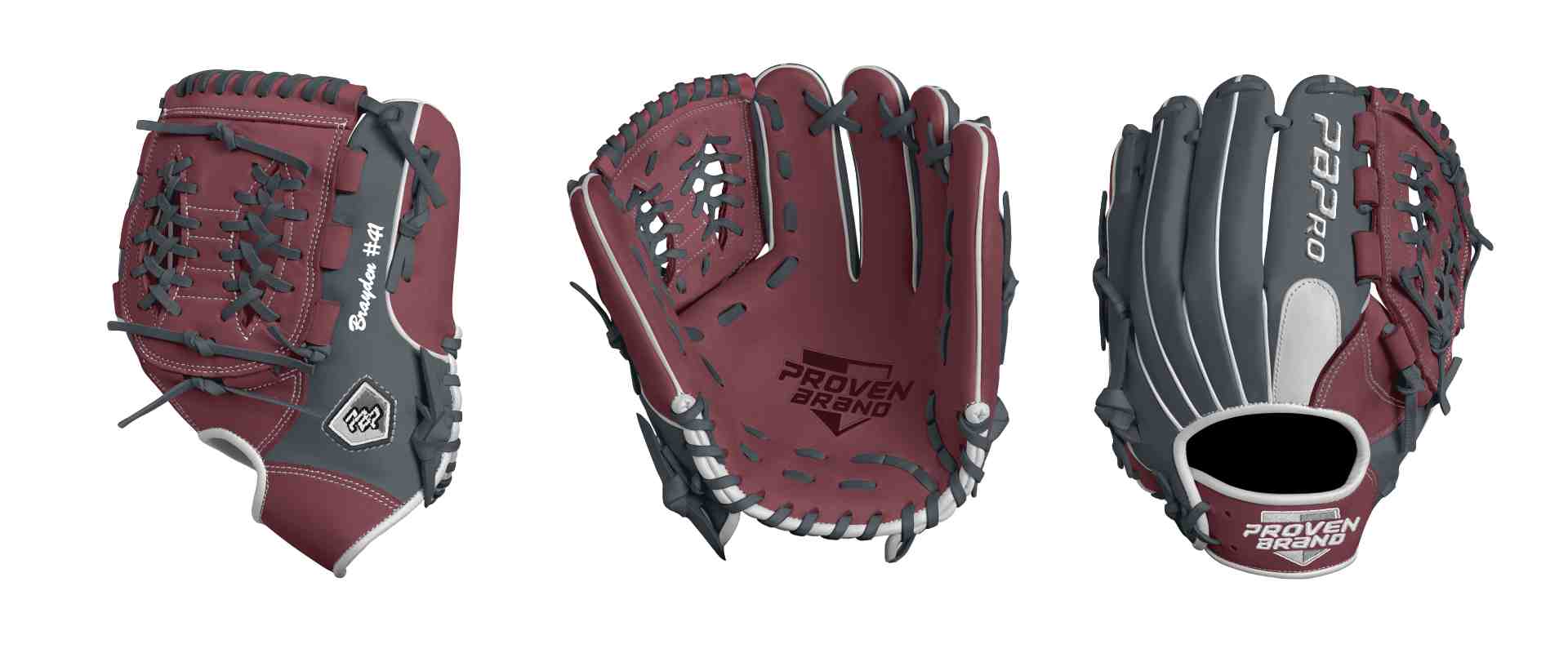 Category: PBPro Custom Product: Baseball Series: Travel Pro Series | USD 159.00 Glove Type: Fielders Size: 11.5" Finger Pad: With Finger Pad Web: Modified Basket Web Palm: Palm (Color: Maroon) Back Shell Main: Back Shell Main (Color: Steel Gray) Back Shell Accent: Back Shell Accent (Color: Maroon) Web: Web (Color: Maroon) Finger Pad: Finger Pad (Color: White) Welting: Welting (Color: White) Binding: Binding (Color: White) Lace: Lace (Color: Steel Gray) Logo and Label-flat: Logo and Label-flat (Color: White) Stitch: Stitch (Color: White) Embroidery: Embroidery (Color: White) Hand Throw: Right Hand Thrower Lace Length: Normal Flex (will not show in customizer): Standard Flex: ( Ideal for Youth Player. Glove still needs to break in) Wrist Opening (will not show in customizer): Standard Wrist Name: Brayden #41 (Font Style: Brush Script MT, Font Color: White, Patch Color: N/A) Flag (Ring Finger): N/A Remarks: N/A
