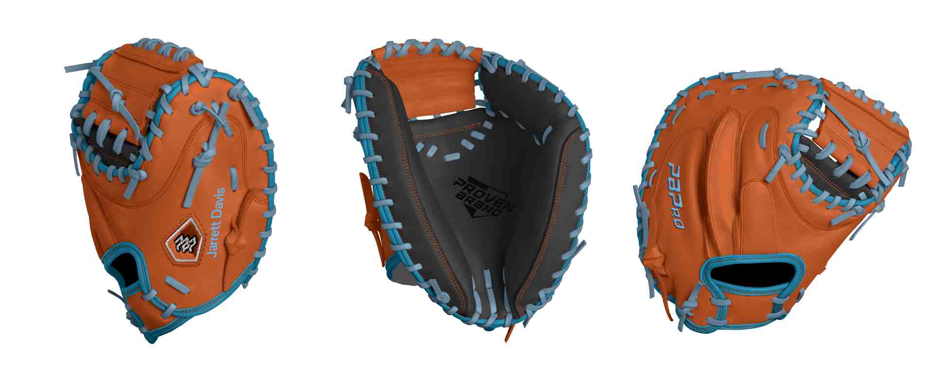 Category: PBPro Custom Product: Baseball Series: Travel Pro Series | USD 159.00 Glove Type: Mitts Size: 33" Catcher's Mitt Palm: Palm (Color: Black) Back Shell: Back Shell (Color: Orange) Web: Web (Color: Orange) Binding: Binding (Color: Sea Blue) Lace: Lace (Color: Sky Blue (#7BAED3)) Logo: Logo (Color: Orange) Stitch: Stitch (Color: Orange) Embroidery: Embroidery (Color: Columbia Blue) Hand Throw: Right Hand Thrower Lace Length: Normal Name: Jarrett Davis (Font Style: Pontano Sans, Font Color: Columbia Blue, Patch Color: N/A) Flag (Ring Finger): United States | USD 4.00 Remarks: N/A