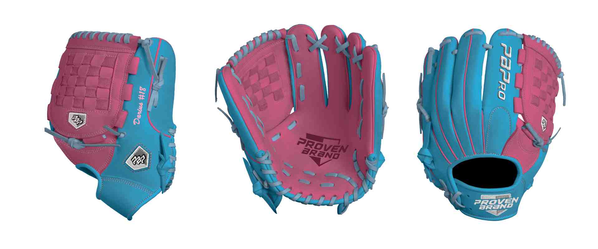 Category: PBPro Custom Product: Baseball Series: Travel Pro Series | USD 159.00 Glove Type: Fielders Size: 11.5" Finger Pad: With Finger Pad Web: Hinged Basket Web Palm: Palm (Color: Shocking Pink) Back Shell Main: Back Shell Main (Color: Sea Blue) Back Shell Accent: Back Shell Accent (Color: Sea Blue) Web: Web (Color: Shocking Pink) Finger Pad: Finger Pad (Color: Sea Blue) Welting: Welting (Color: Shocking Pink) Binding: Binding (Color: Sea Blue) Lace: Lace (Color: Sky Blue (#7BAED3)) Logo and Label-flat: Logo and Label-flat (Color: White) Stitch: Stitch (Color: Carnation Pink) Embroidery: Embroidery (Color: White) Hand Throw: Right Hand Thrower Lace Length: Normal Flex (will not show in customizer): Standard Flex: ( Ideal for Youth Player. Glove still needs to break in) Wrist Opening (will not show in customizer): Standard Wrist Name: Darius #18 (Font Style: Brush Script MT, Font Color: Carnation Pink, Patch Color: N/A) Flag (Ring Finger): N/A Remarks: N/A