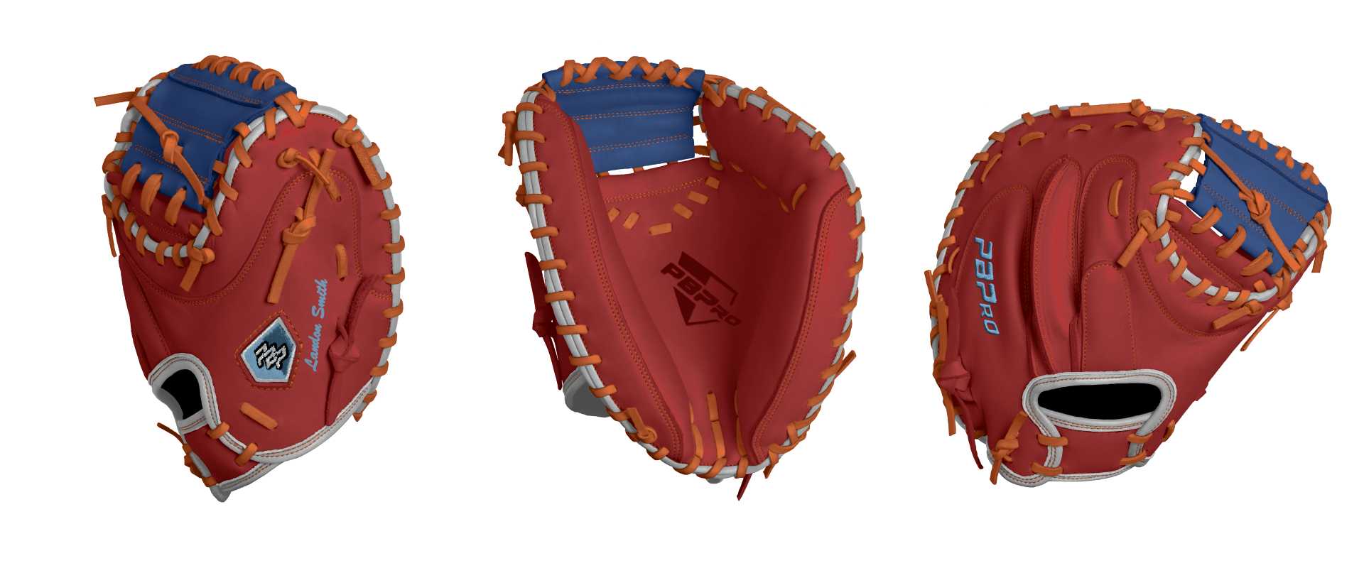 Category: PBPro Custom Product: Baseball Series: Travel Pro Series | USD 149.00 Glove Type: Mitts Size: 33.5" Catcher's Mitt Palm: Palm (Color: Red) Back Shell: Back Shell (Color: Red) Web: Web (Color: Royal) Binding: Binding (Color: White) Lace: Lace (Color: Orange) Logo: Logo (Color: Columbia Blue) Stitch: Stitch (Color: Orange) Embroidery: Embroidery (Color: Columbia Blue) Hand Throw: Right Hand Thrower Lace Length: Normal Name: Landon Smith (Font Style: Brush Script MT, Font Color: Columbia Blue, Patch Color: N/A) Flag (Ring Finger): United States Remarks: N/A