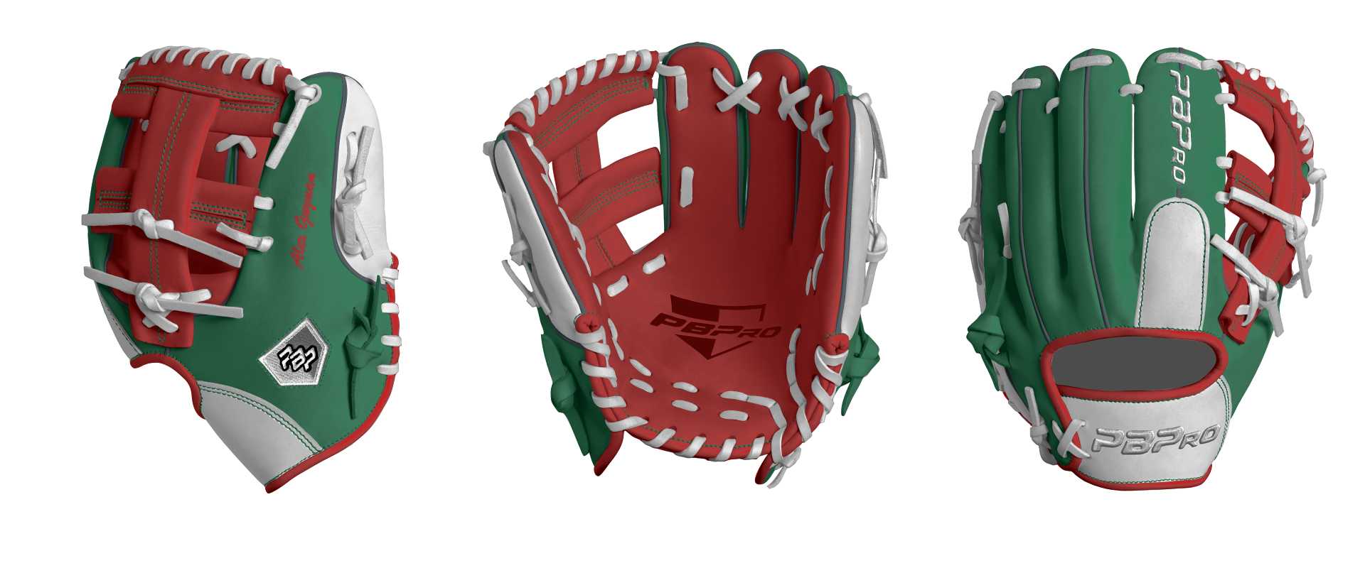 Category: PBPro Custom Product: Baseball Series: Travel Pro Series | USD 149.00 Glove Type: Fielders Size: 11" Finger Pad: With Finger Pad Web: New Cross Web Palm: Palm (Color: Red) Back Shell Main: Back Shell Main (Color: Green) Back Shell Accent: Back Shell Accent (Color: White) Web: Web (Color: Red) Finger Pad: Finger Pad (Color: White) Welting: Welting (Color: Steel Gray) Binding: Binding (Color: Red) Lace: Lace (Color: White) Logo and Label: Logo and Label (Color: White) Stitch: Stitch (Color: Green) Embroidery: Embroidery (Color: White) Hand Throw: Right Hand Thrower Lace Length: Normal Name: Alex Guzman (Font Style: Brush Script MT, Font Color: Red, Patch Color: N/A) Flag (Ring Finger): Mexico Remarks: N/A