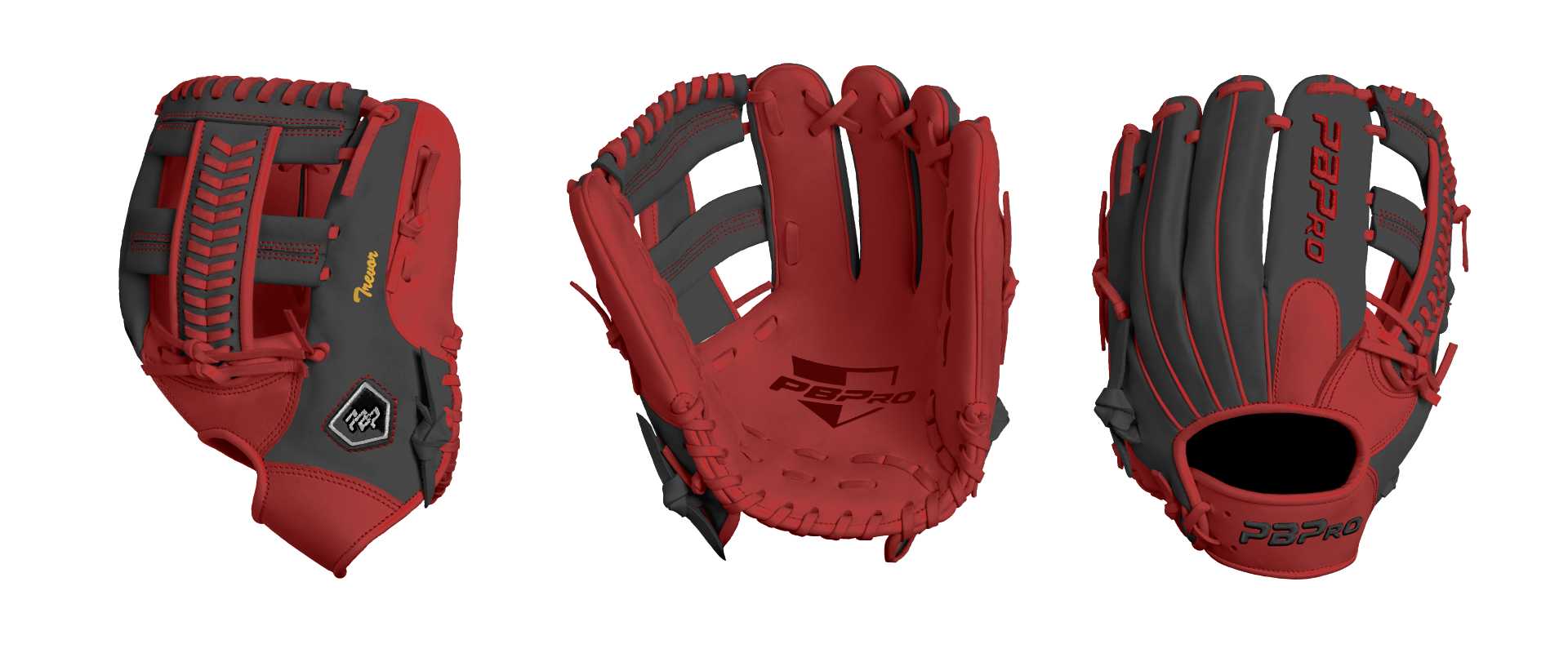 Category: PBPro Custom Product: Baseball Series: Travel Pro Series | USD 149.00 Glove Type: Fielders Size: 11.25" Finger Pad: With Finger Pad Web: X-Laced Single Post Web Palm: Palm (Color: Red) Back Shell Main: Back Shell Main (Color: Black) Back Shell Accent: Back Shell Accent (Color: Red) Web: Web (Color: Black) Finger Pad: Finger Pad (Color: Red) Welting: Welting (Color: Red) Binding: Binding (Color: Red) Lace: Lace (Color: Red) Logo and Label: Logo and Label (Color: Black) Stitch: Stitch (Color: Red) Embroidery: Embroidery (Color: Red) Hand Throw: Right Hand Thrower Lace Length: Long (will not show in customizer) Name: Trevor (Font Style: Brush Script MT, Font Color: G.Yellow, Patch Color: N/A) Flag (Ring Finger): N/A Remarks: N/A