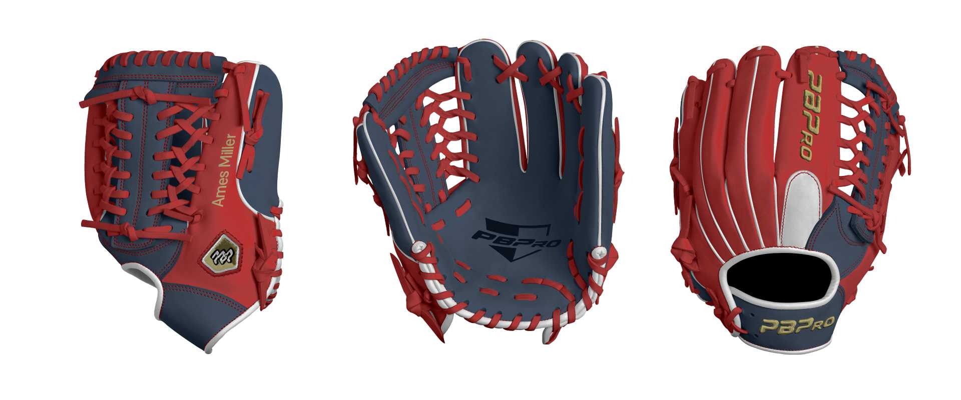 Category: PBPro Custom Product: Baseball Series: Travel Pro Series | USD 149.00 Glove Type: Fielders Size: 11.5" Finger Pad: With Finger Pad Web: Modified Trap Web Palm: Palm (Color: Navy) Back Shell Main: Back Shell Main (Color: Red) Back Shell Accent: Back Shell Accent (Color: Navy) Web: Web (Color: Navy) Finger Pad: Finger Pad (Color: White) Welting: Welting (Color: White) Binding: Binding (Color: White) Lace: Lace (Color: Red) Logo and Label: Logo and Label (Color: Vegas Gold) Stitch: Stitch (Color: Red) Embroidery: Embroidery (Color: Vegas Gold) Hand Throw: Right Hand Thrower Lace Length: Long (will not show in customizer) Name: Ames Miller (Font Style: Pontano Sans, Font Color: Vegas Gold, Patch Color: N/A) Flag (Ring Finger): North Carolina Remarks: N/A