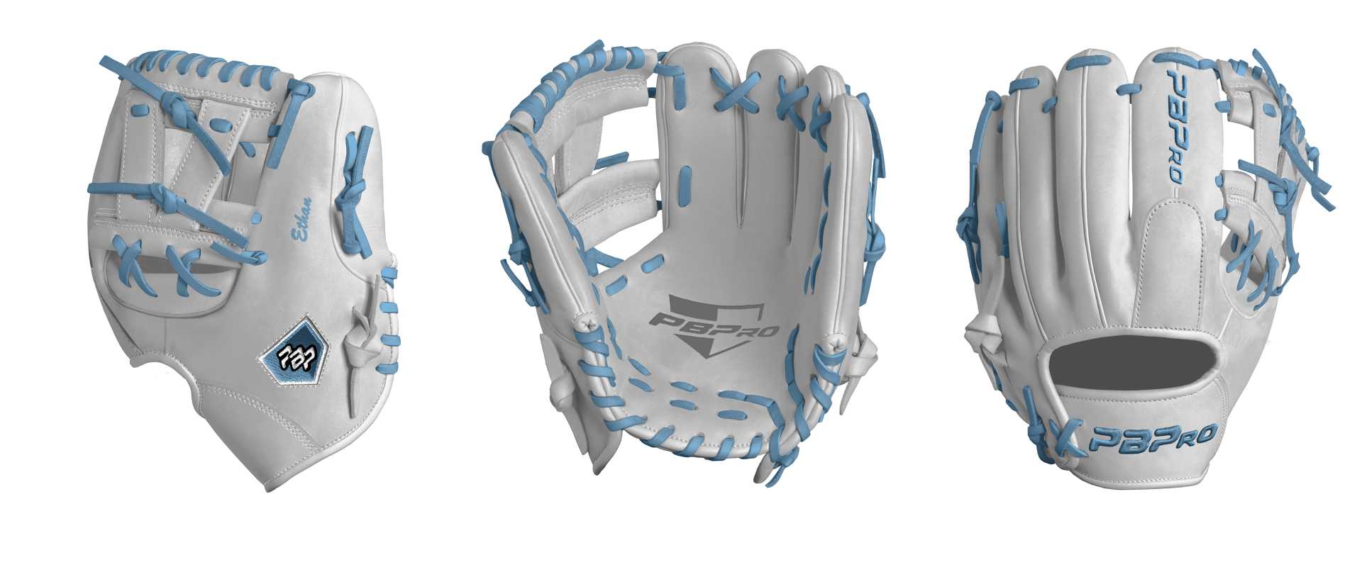 Category: PBPro Custom Product: Baseball Series: Travel Pro Series | USD 149.00 Glove Type: Fielders Size: 11" Finger Pad: With Finger Pad Web: Pro V Web Palm: Palm (Color: White) Back Shell Main: Back Shell Main (Color: White) Back Shell Accent: Back Shell Accent (Color: White) Web: Web (Color: White) Finger Pad: Finger Pad (Color: White) Welting: Welting (Color: White) Binding: Binding (Color: White) Lace: Lace (Color: Columbia Blue) Logo and Label: Logo and Label (Color: Columbia Blue) Stitch: Stitch (Color: White) Embroidery: Embroidery (Color: Columbia Blue) Hand Throw: Right Hand Thrower Lace Length: Long (will not show in customizer) Name: Ethan (Font Style: Brush Script MT, Font Color: Columbia Blue, Patch Color: N/A) Flag (Ring Finger): Arizona Remarks: N/A