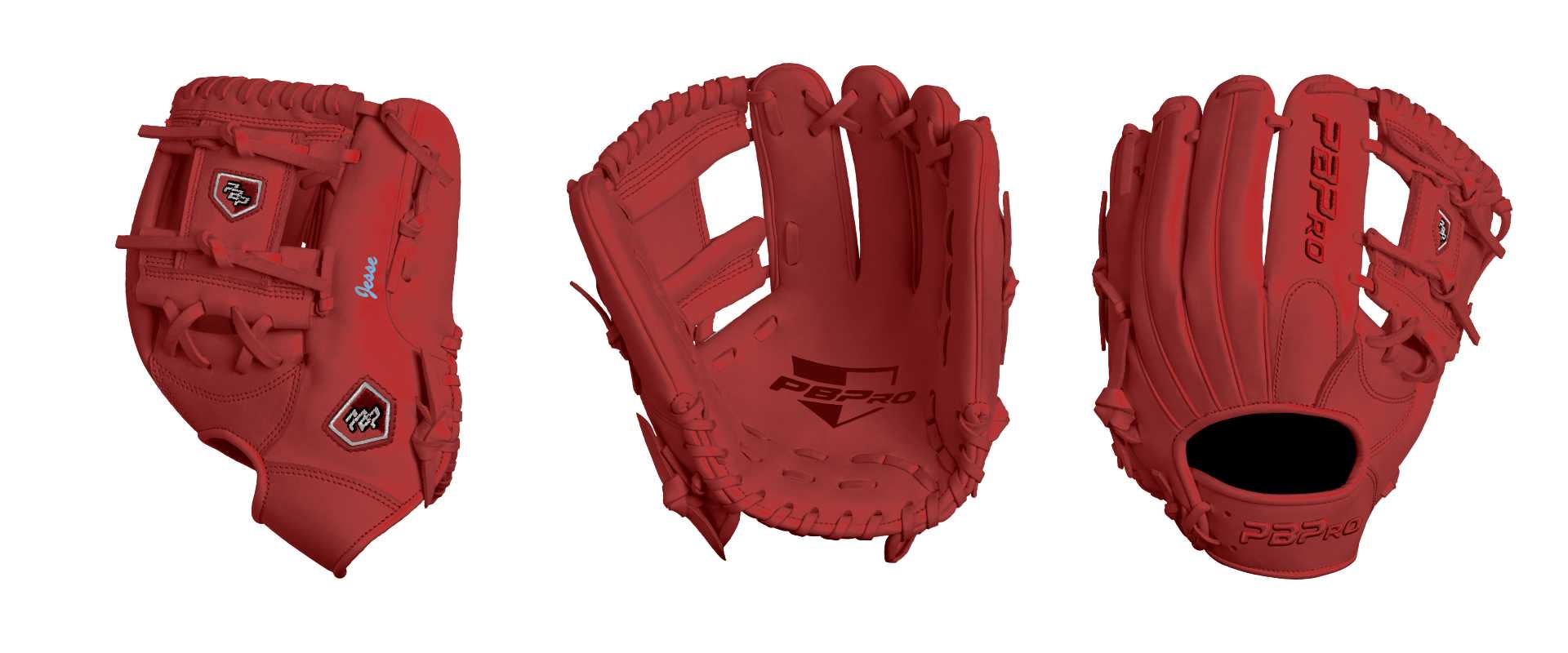 Category: PBPro Custom Product: Baseball Series: Travel Pro Series | USD 149.00 Glove Type: Fielders Size: 11.25" Finger Pad: With Finger Pad Web: Pro I Web Palm: Palm (Color: Red) Back Shell Main: Back Shell Main (Color: Red) Back Shell Accent: Back Shell Accent (Color: Red) Web: Web (Color: Red) Finger Pad: Finger Pad (Color: Red) Welting: Welting (Color: Red) Binding: Binding (Color: Red) Lace: Lace (Color: Red) Logo and Label: Logo and Label (Color: Red) Stitch: Stitch (Color: Red) Embroidery: Embroidery (Color: Red) Hand Throw: Right Hand Thrower Lace Length: Long (will not show in customizer) Name: Jesse (Font Style: Brush Script MT, Font Color: Columbia Blue, Patch Color: N/A) Flag (Ring Finger): Texas Remarks: badass