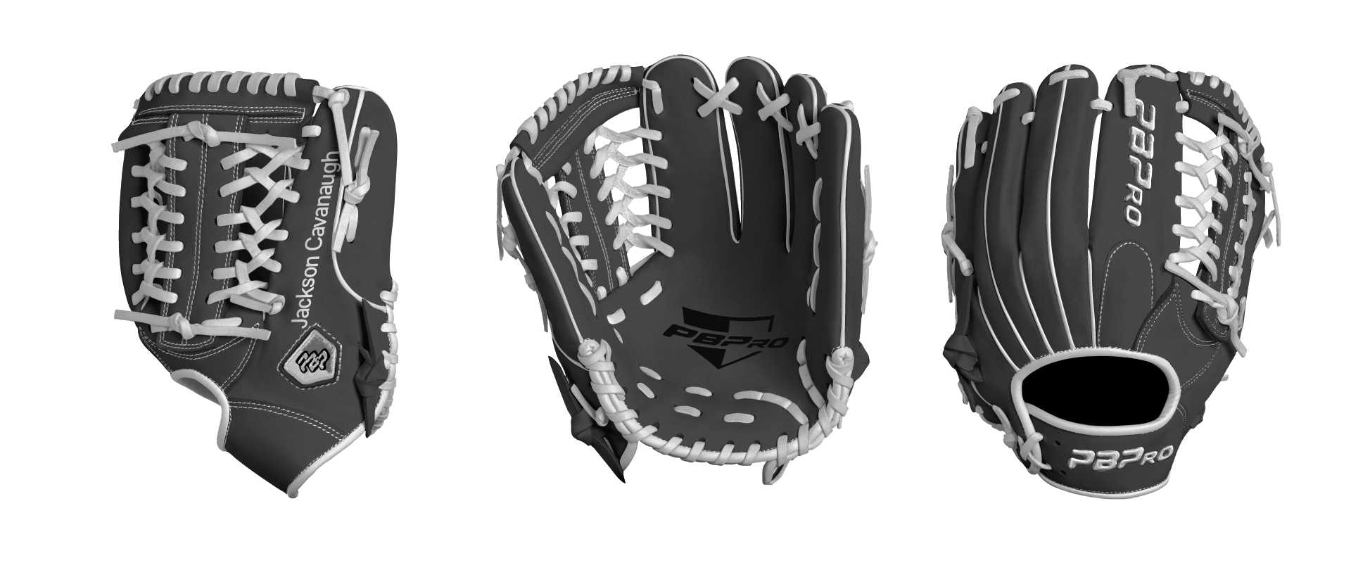 Category: PBPro Custom Product: Baseball Series: Travel Pro Series | USD 149.00 Glove Type: Fielders Size: 11.5" Finger Pad: With Finger Pad Web: Modified Trap Web Palm: Palm (Color: Black) Back Shell Main: Back Shell Main (Color: Black) Back Shell Accent: Back Shell Accent (Color: Black) Web: Web (Color: Black) Finger Pad: Finger Pad (Color: Black) Welting: Welting (Color: White) Binding: Binding (Color: White) Lace: Lace (Color: White) Logo and Label: Logo and Label (Color: White) Stitch: Stitch (Color: White) Embroidery: Embroidery (Color: White) Hand Throw: Right Hand Thrower Lace Length: Normal Name: Jackson Cavanaugh (Font Style: Pontano Sans, Font Color: White, Patch Color: N/A) Flag (Ring Finger): United States Remarks: N/A