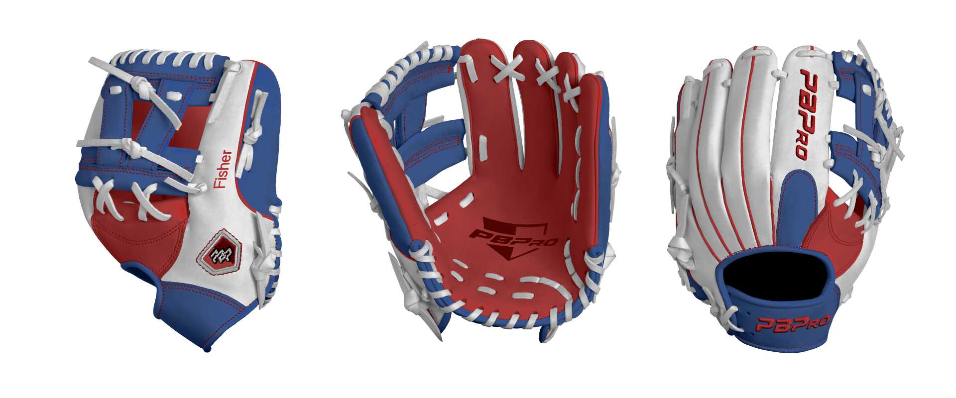 Category: PBPro Custom Product: Baseball Series: Travel Pro Series | USD 149.00 Glove Type: Fielders Size: 11.5" Finger Pad: With Finger Pad Web: Pro V Web Palm: Palm (Color: Red) Back Shell Main: Back Shell Main (Color: White) Back Shell Accent: Back Shell Accent (Color: Royal) Web: Web (Color: Royal) Finger Pad: Finger Pad (Color: Royal) Welting: Welting (Color: Red) Binding: Binding (Color: Royal) Lace: Lace (Color: White) Logo and Label: Logo and Label (Color: Red) Stitch: Stitch (Color: Red) Embroidery: Embroidery (Color: Red) Hand Throw: Left Hand Thrower Lace Length: Normal Name: Fisher (Font Style: Pontano Sans, Font Color: Red, Patch Color: N/A) Flag (Ring Finger): United States Remarks: N/A