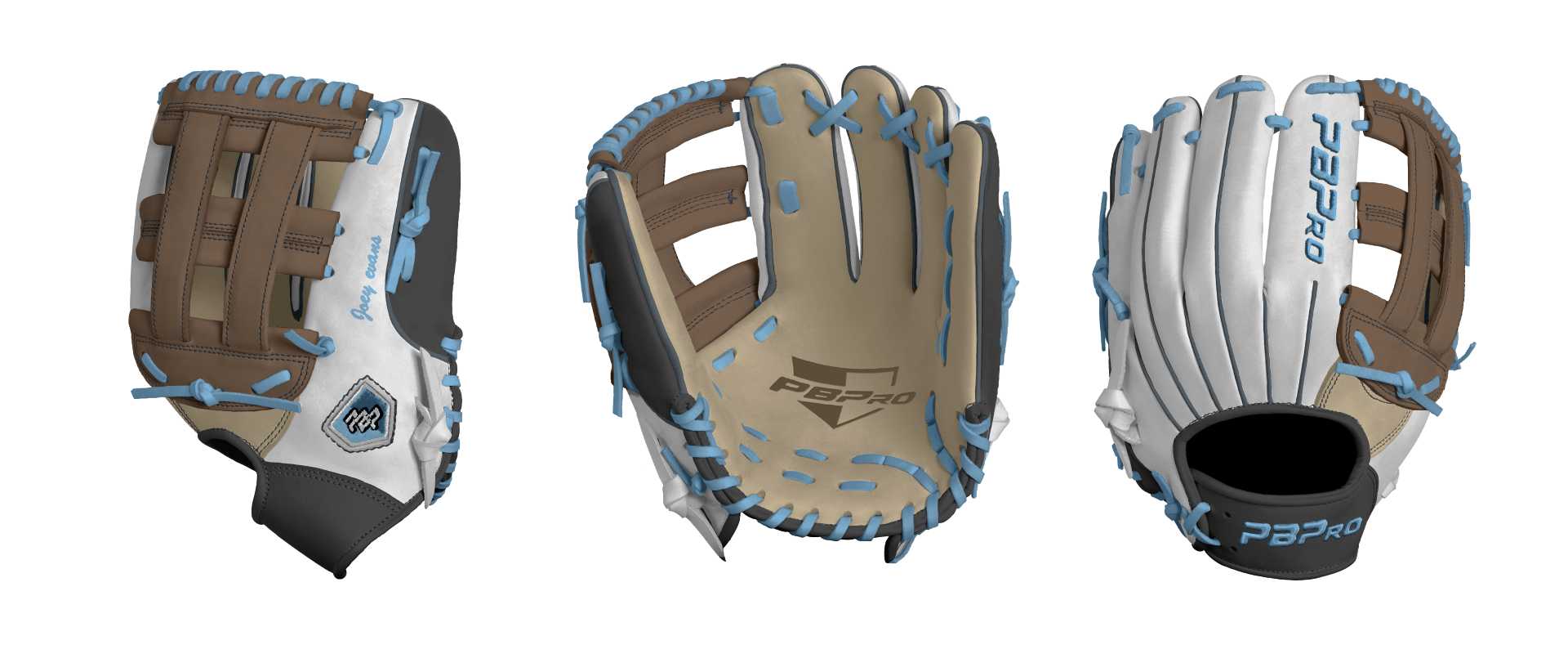 Category: PBPro Custom Product: Baseball Series: Travel Pro Series | USD 149.00 Glove Type: Fielders Size: 12.25" Finger Pad: Without Finger Pad Web: Pro H Web Palm: Palm (Color: Cream) Back Shell Main: Back Shell Main (Color: White) Back Shell Accent: Back Shell Accent (Color: Black) Web: Web (Color: Dark Brown) Welting: Welting (Color: Steel Gray) Binding: Binding (Color: Black) Lace: Lace (Color: Columbia Blue) Logo and Label: Logo and Label (Color: Columbia Blue) Stitch: Stitch (Color: Steel Gray) Embroidery: Embroidery (Color: Columbia Blue) Hand Throw: Right Hand Thrower Lace Length: Normal Name: Joey evans (Font Style: Brush Script MT, Font Color: Columbia Blue, Patch Color: N/A) Flag (Ring Finger): United States Remarks: N/A