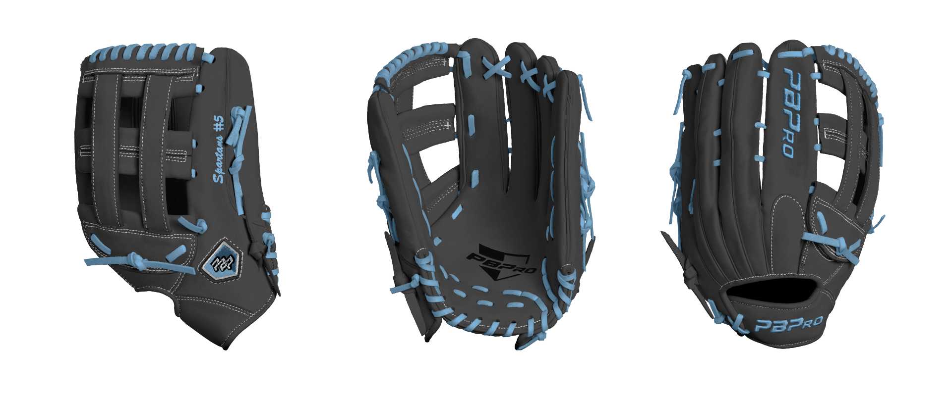 Category: PBPro Custom Product: Baseball Series: Travel Pro Series | USD 149.00 Glove Type: Fielders Size: 13" Finger Pad: With Finger Pad Web: Pro H Web Palm: Palm (Color: Black) Back Shell Main: Back Shell Main (Color: Black) Back Shell Accent: Back Shell Accent (Color: Black) Web: Web (Color: Black) Finger Pad: Finger Pad (Color: Black) Welting: Welting (Color: Black) Binding: Binding (Color: Black) Lace: Lace (Color: Columbia Blue) Logo and Label: Logo and Label (Color: Columbia Blue) Stitch: Stitch (Color: White) Embroidery: Embroidery (Color: Columbia Blue) Hand Throw: Right Hand Thrower Lace Length: Normal Name: Spartans #5 (Font Style: Brush Script MT, Font Color: Columbia Blue, Patch Color: N/A) Flag (Ring Finger): Mexico Remarks: N/A