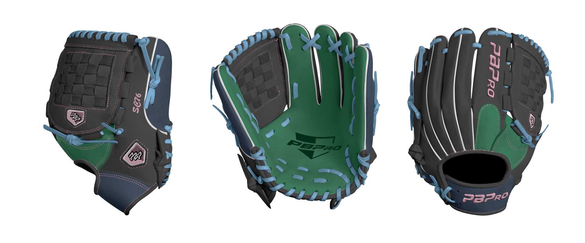 Category: PBPro Custom Product: Baseball Series: Travel Pro Series | USD 149.00 Glove Type: Fielders Size: 11.75" Finger Pad: With Finger Pad Web: Basket Web Palm: Palm (Color: Green) Back Shell Main: Back Shell Main (Color: Black) Back Shell Accent: Back Shell Accent (Color: Navy) Web: Web (Color: Black) Finger Pad: Finger Pad (Color: Green) Welting: Welting (Color: White) Binding: Binding (Color: Black) Lace: Lace (Color: Columbia Blue) Logo and Label: Logo and Label (Color: C.Pink) Stitch: Stitch (Color: C.Pink) Embroidery: Embroidery (Color: C.Pink) Hand Throw: Right Hand Thrower Lace Length: Normal Name: SC76 (Font Style: Brush Script MT, Font Color: C.Pink, Patch Color: N/A) Flag (Ring Finger): N/A Remarks: N/A