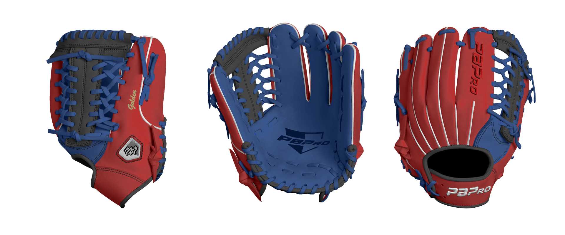 Category: PBPro Custom Product: Baseball Series: Travel Pro Series | USD 149.00 Glove Type: Fielders Size: 12" Finger Pad: Without Finger Pad Web: Modified Trap Web Palm: Palm (Color: Royal) Back Shell Main: Back Shell Main (Color: Red) Back Shell Accent: Back Shell Accent (Color: Red) Web: Web (Color: Black) Welting: Welting (Color: White) Binding: Binding (Color: Black) Lace: Lace (Color: Royal) Logo and Label: Logo and Label (Color: White) Stitch: Stitch (Color: Black) Embroidery: Embroidery (Color: Red) Hand Throw: Right Hand Thrower Lace Length: Normal Name: Golden (Font Style: Brush Script MT, Font Color: Vegas Gold, Patch Color: N/A) Flag (Ring Finger): United States Remarks: N/A