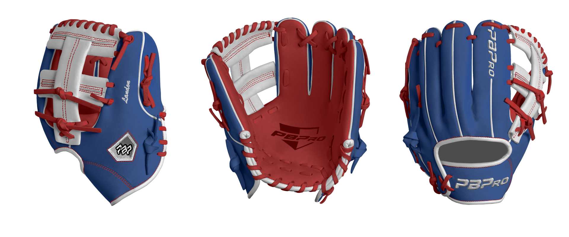 Category: PBPro Custom Product: Baseball Series: Travel Pro Series | USD 149.00 Glove Type: Fielders Size: 11" Finger Pad: Without Finger Pad Web: New Cross Web Palm: Palm (Color: Red) Back Shell Main: Back Shell Main (Color: Royal) Back Shell Accent: Back Shell Accent (Color: Royal) Web: Web (Color: White) Welting: Welting (Color: White) Binding: Binding (Color: White) Lace: Lace (Color: Red) Logo and Label: Logo and Label (Color: White) Stitch: Stitch (Color: Red) Embroidery: Embroidery (Color: White) Hand Throw: Right Hand Thrower Lace Length: Normal Name: Landon (Font Style: Brush Script MT, Font Color: White, Patch Color: N/A) Flag (Ring Finger): United States Remarks: #9