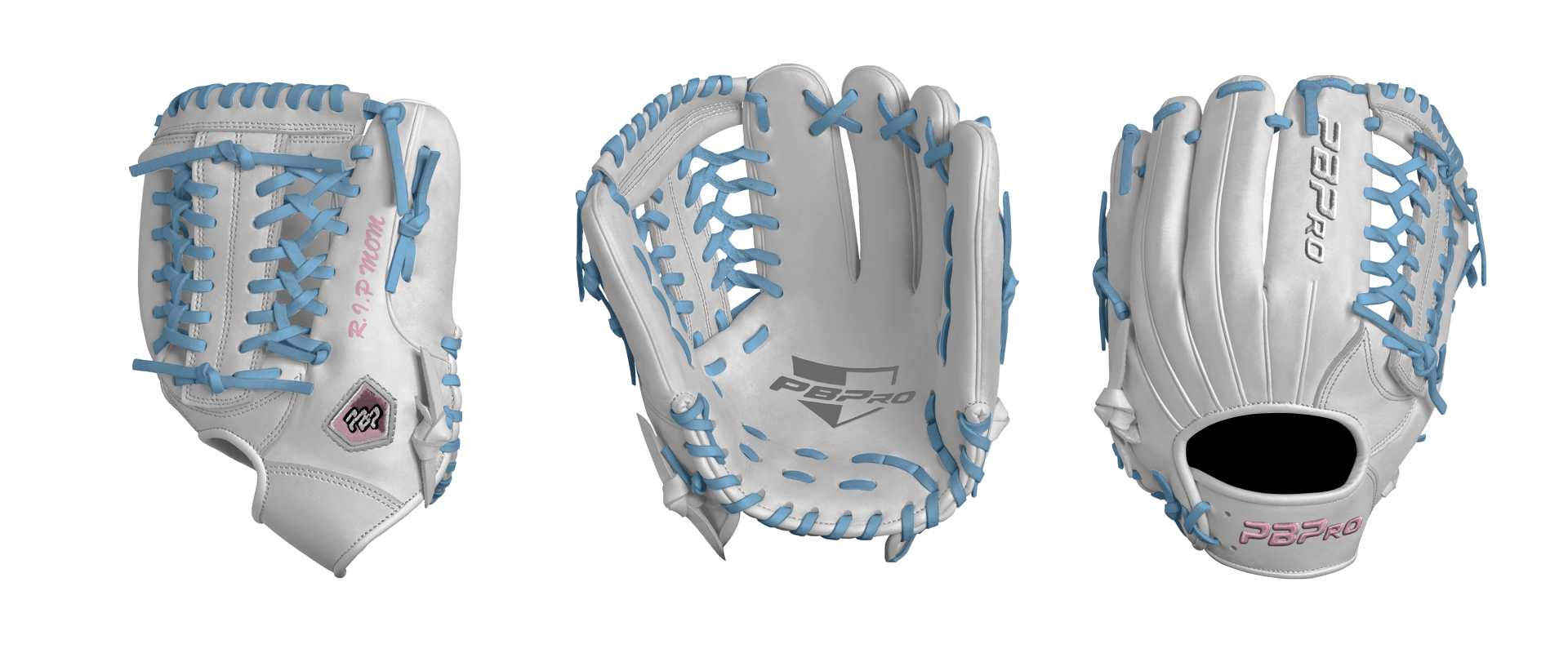 Category: PBPro Custom Product: Baseball Series: Travel Pro Series | USD 149.00 Glove Type: Fielders Size: 11.5" Finger Pad: Without Finger Pad Web: Modified Trap Web Palm: Palm (Color: White) Back Shell Main: Back Shell Main (Color: White) Back Shell Accent: Back Shell Accent (Color: White) Web: Web (Color: White) Welting: Welting (Color: White) Binding: Binding (Color: White) Lace: Lace (Color: Columbia Blue) Logo and Label: Logo and Label (Color: C.Pink) Stitch: Stitch (Color: White) Embroidery: Embroidery (Color: White) Hand Throw: Right Hand Thrower Lace Length: Normal Name: R.I.P MOM (Font Style: Brush Script MT, Font Color: C.Pink, Patch Color: N/A) Flag (Ring Finger): Dominican Republic Remarks: N/A