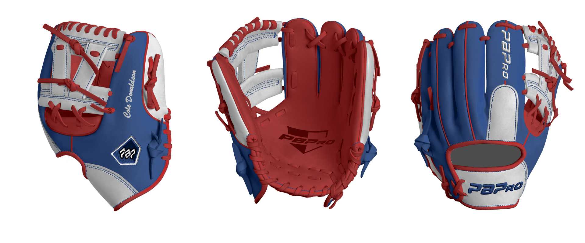 Category: PBPro Custom Product: Baseball Series: Travel Pro Series | USD 149.00 Glove Type: Fielders Size: 11" Finger Pad: With Finger Pad Web: Pro V Web Palm: Palm (Color: Red) Back Shell Main: Back Shell Main (Color: Royal) Back Shell Accent: Back Shell Accent (Color: White) Web: Web (Color: White) Finger Pad: Finger Pad (Color: White) Welting: Welting (Color: Red) Binding: Binding (Color: Red) Lace: Lace (Color: Red) Logo and Label: Logo and Label (Color: Royal) Stitch: Stitch (Color: Royal) Embroidery: Embroidery (Color: White) Hand Throw: Right Hand Thrower Lace Length: Normal Name: Cole Donaldson (Font Style: Brush Script MT, Font Color: White, Patch Color: N/A) Flag (Ring Finger): United States Remarks: N/A