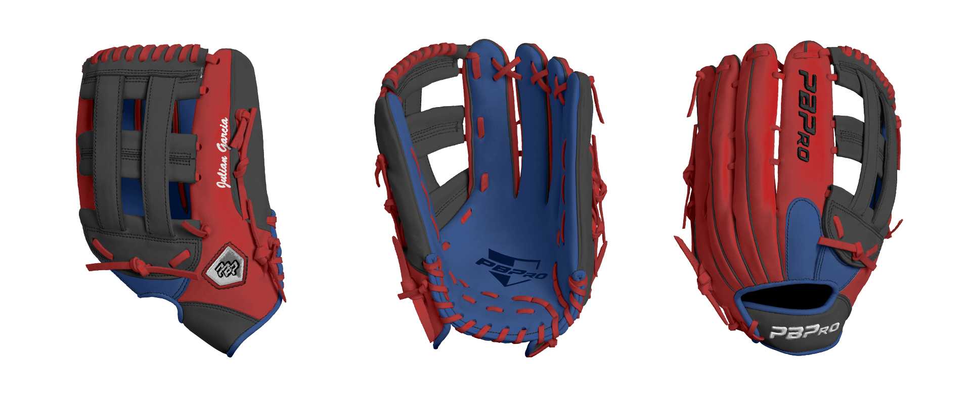 Category: PBPro Custom Product: Baseball Series: Travel Pro Series | USD 149.00 Glove Type: Fielders Size: 13" Finger Pad: With Finger Pad Web: Pro H Web Palm: Palm (Color: Royal) Back Shell Main: Back Shell Main (Color: Red) Back Shell Accent: Back Shell Accent (Color: Black) Web: Web (Color: Black) Finger Pad: Finger Pad (Color: Royal) Welting: Welting (Color: Black) Binding: Binding (Color: Royal) Lace: Lace (Color: Red) Logo and Label: Logo and Label (Color: White) Stitch: Stitch (Color: Black) Embroidery: Embroidery (Color: Black) Hand Throw: Right Hand Thrower Lace Length: Normal Name: Julian Garcia (Font Style: Brush Script MT, Font Color: White, Patch Color: N/A) Flag (Ring Finger): United States Remarks: Break it in