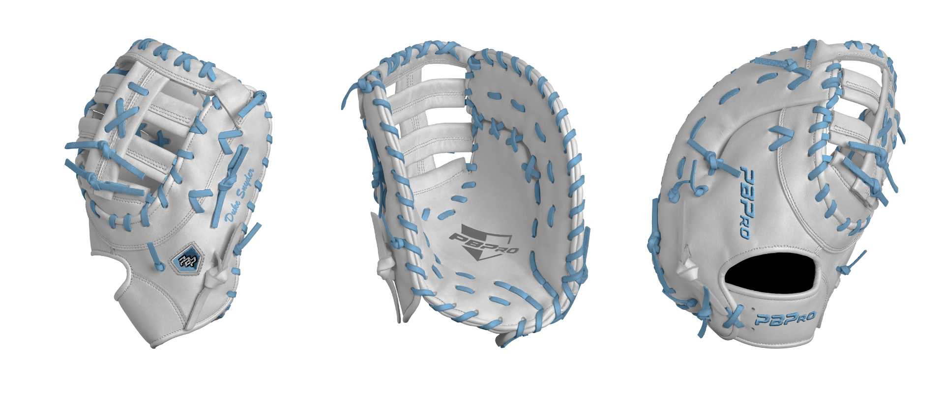 Category: PBPro Custom Product: Baseball Series: Travel Pro Series | USD 149.00 Glove Type: Mitts Size: 13" First Base Palm: Palm (Color: White) Back Shell: Back Shell (Color: White) Web: Web (Color: White) Binding: Binding (Color: White) Lace: Lace (Color: Columbia Blue) Logo and Label: Logo and Label (Color: Columbia Blue) Stitch: Stitch (Color: White) Embroidery: Embroidery (Color: Columbia Blue) Hand Throw: Left Hand Thrower Lace Length: Normal Name: Duke Snyder (Font Style: Brush Script MT, Font Color: Columbia Blue, Patch Color: N/A) Flag (Ring Finger): N/A Remarks: N/A
