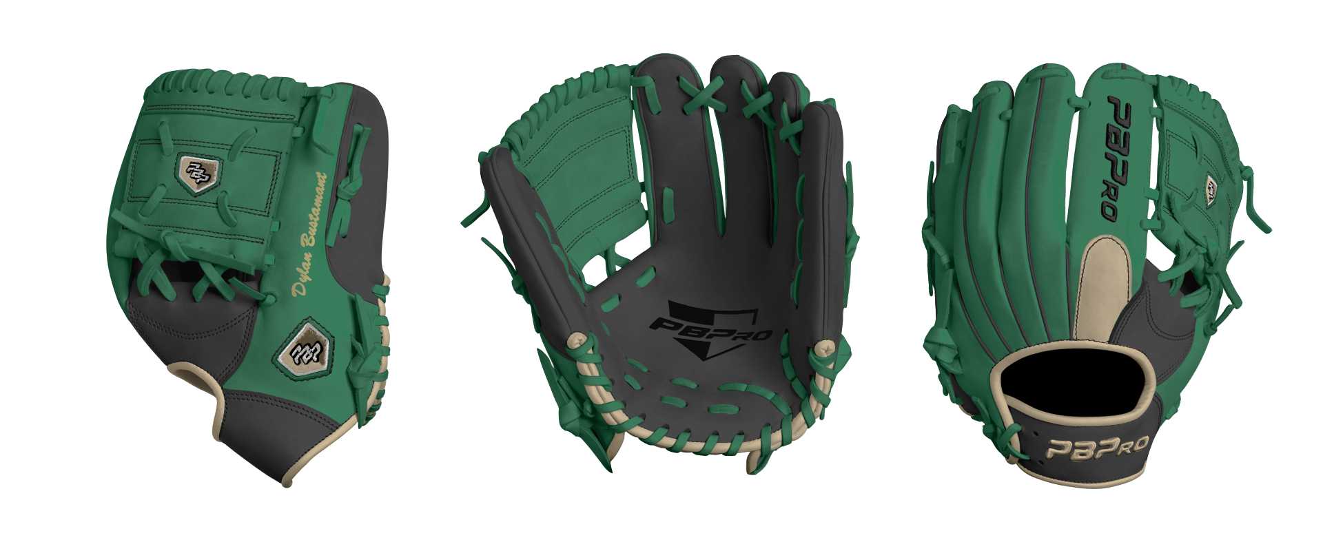 Category: PBPro Custom Product: Baseball Series: Travel Pro Series | USD 149.00 Glove Type: Fielders Size: 11.25" Finger Pad: With Finger Pad Web: One Piece Web Palm: Palm (Color: Black) Back Shell Main: Back Shell Main (Color: Green) Back Shell Accent: Back Shell Accent (Color: Black) Web: Web (Color: Green) Finger Pad: Finger Pad (Color: Cream) Welting: Welting (Color: Black) Binding: Binding (Color: Cream) Lace: Lace (Color: Green) Logo and Label: Logo and Label (Color: Cream) Stitch: Stitch (Color: Black) Embroidery: Embroidery (Color: Black) Hand Throw: Right Hand Thrower Lace Length: Long (will not show in customizer) Name: Dylan Bustamant (Font Style: Brush Script MT, Font Color: Vegas Gold, Patch Color: N/A) Flag (Ring Finger): Arizona Remarks: N/A