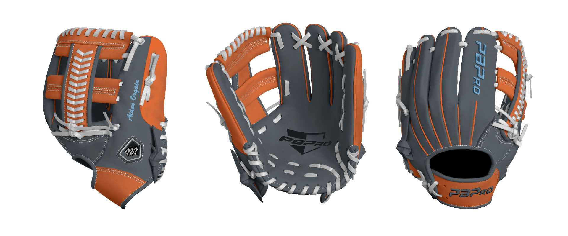 Category: PBPro Custom Product: Baseball Series: Travel Pro Series | USD 149.00 Glove Type: Fielders Size: 11.25" Finger Pad: Without Finger Pad Web: X-Laced Single Post Web Palm: Palm (Color: Steel Gray) Back Shell Main: Back Shell Main (Color: Steel Gray) Back Shell Accent: Back Shell Accent (Color: Orange) Web: Web (Color: Orange) Welting: Welting (Color: Orange) Binding: Binding (Color: Steel Gray) Lace: Lace (Color: White) Logo and Label: Logo and Label (Color: Steel Gray) Stitch: Stitch (Color: White) Embroidery: Embroidery (Color: Columbia Blue) Hand Throw: Right Hand Thrower Lace Length: Long (will not show in customizer) Name: Aiden Orgain (Font Style: Brush Script MT, Font Color: Columbia Blue, Patch Color: N/A) Flag (Ring Finger): N/A Remarks: N/A