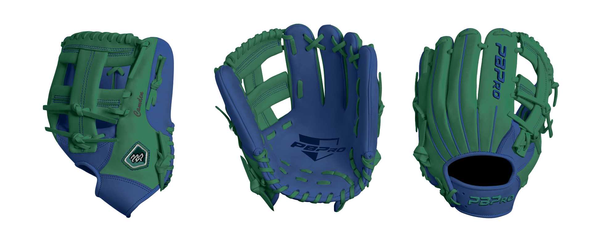 Category: PBPro Custom Product: Baseball Series: Travel Pro Series | USD 149.00 Glove Type: Fielders Size: 11.75" Finger Pad: Without Finger Pad Web: New Cross Web Palm: Palm (Color: Royal) Back Shell Main: Back Shell Main (Color: Green) Back Shell Accent: Back Shell Accent (Color: Royal) Web: Web (Color: Green) Welting: Welting (Color: Royal) Binding: Binding (Color: Royal) Lace: Lace (Color: Green) Logo and Label: Logo and Label (Color: Northwest Green) Stitch: Stitch (Color: Royal) Embroidery: Embroidery (Color: Royal) Hand Throw: Right Hand Thrower Lace Length: Normal Name: Camden (Font Style: Brush Script MT, Font Color: Black, Patch Color: N/A) Flag (Ring Finger): N/A Remarks: Flair thumb and pinky please