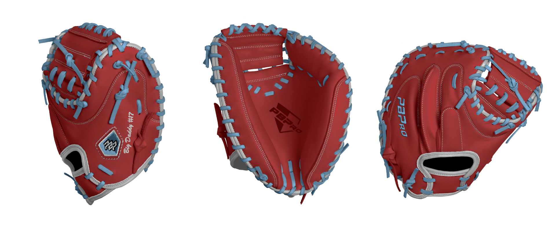 Category: PBPro Custom Product: Baseball Series: Travel Pro Series | USD 149.00 Glove Type: Mitts Size: 33.5" Catcher's Mitt Palm: Palm (Color: Red) Back Shell: Back Shell (Color: Red) Web: Web (Color: Red) Binding: Binding (Color: White) Lace: Lace (Color: Columbia Blue) Logo: Logo (Color: Columbia Blue) Stitch: Stitch (Color: White) Embroidery: Embroidery (Color: Columbia Blue) Hand Throw: Right Hand Thrower Lace Length: Normal Name: Big Daddy #17 (Font Style: Brush Script MT, Font Color: White, Patch Color: N/A) Flag (Ring Finger): United States Remarks: N/A