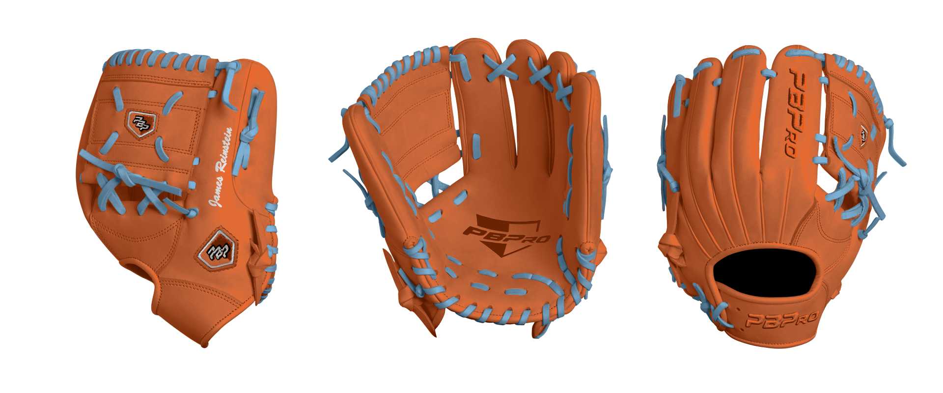 Category: PBPro Custom Product: Baseball Series: Travel Pro Series | USD 149.00 Glove Type: Fielders Size: 11.25" Finger Pad: Without Finger Pad Web: One Piece Web Palm: Palm (Color: Orange) Back Shell Main: Back Shell Main (Color: Orange) Back Shell Accent: Back Shell Accent (Color: Orange) Web: Web (Color: Orange) Welting: Welting (Color: Orange) Binding: Binding (Color: Orange) Lace: Lace (Color: Columbia Blue) Logo and Label: Logo and Label (Color: Orange) Stitch: Stitch (Color: Orange) Embroidery: Embroidery (Color: Orange) Hand Throw: Right Hand Thrower Lace Length: Normal Name: James Reinstein (Font Style: Brush Script MT, Font Color: White, Patch Color: N/A) Flag (Ring Finger): United States Remarks: N/A
