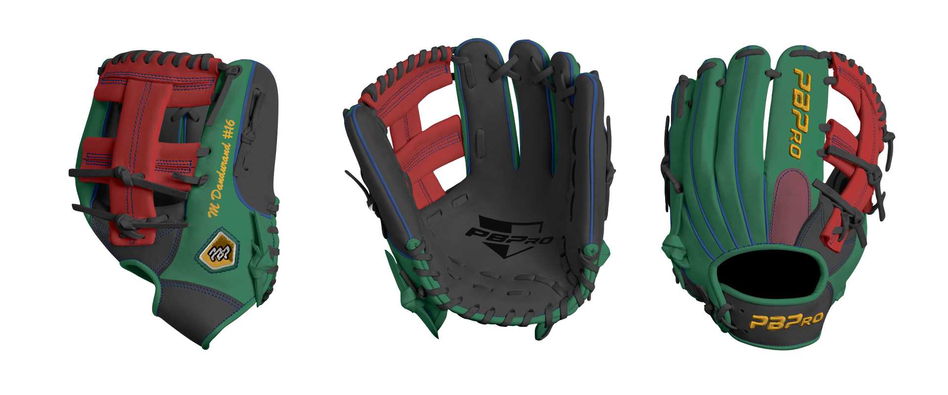 Category: PBPro Custom Product: Baseball Series: Travel Pro Series | USD 149.00 Glove Type: Fielders Size: 11.5" Finger Pad: With Finger Pad Web: New Cross Web Palm: Palm (Color: Black) Back Shell Main: Back Shell Main (Color: Green) Back Shell Accent: Back Shell Accent (Color: Black) Web: Web (Color: Red) Finger Pad: Finger Pad (Color: Maroon) Welting: Welting (Color: Royal) Binding: Binding (Color: Green) Lace: Lace (Color: Black) Logo and Label: Logo and Label (Color: G.Yellow) Stitch: Stitch (Color: Royal) Embroidery: Embroidery (Color: G.Yellow) Hand Throw: Left Hand Thrower Lace Length: Long (will not show in customizer) Name: M Dandurand #16 (Font Style: Brush Script MT, Font Color: G.Yellow, Patch Color: N/A) Flag (Ring Finger): California Remarks: N/A