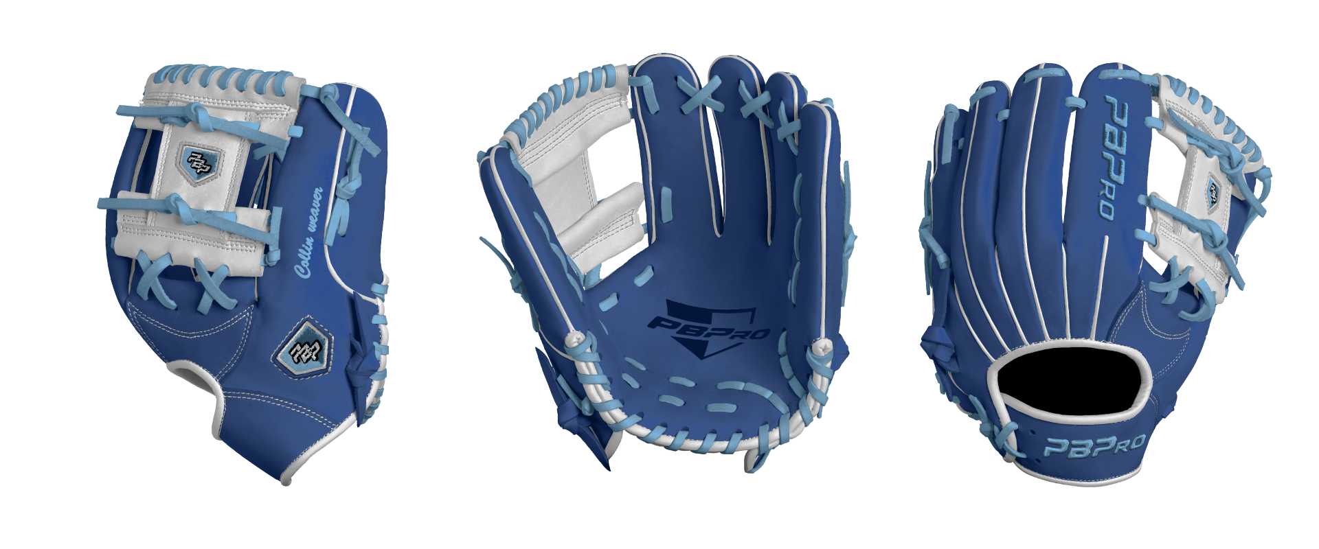 Category: PBPro Custom Product: Baseball Series: Travel Pro Series | USD 149.00 Glove Type: Fielders Size: 11.25" Finger Pad: Without Finger Pad Web: Pro I Web Palm: Palm (Color: Royal) Back Shell Main: Back Shell Main (Color: Royal) Back Shell Accent: Back Shell Accent (Color: Royal) Web: Web (Color: White) Welting: Welting (Color: White) Binding: Binding (Color: White) Lace: Lace (Color: Columbia Blue) Logo and Label: Logo and Label (Color: Columbia Blue) Stitch: Stitch (Color: White) Embroidery: Embroidery (Color: Columbia Blue) Hand Throw: Right Hand Thrower Lace Length: Normal Name: Collin weaver (Font Style: Brush Script MT, Font Color: Columbia Blue, Patch Color: N/A) Flag (Ring Finger): United States Remarks: N/A