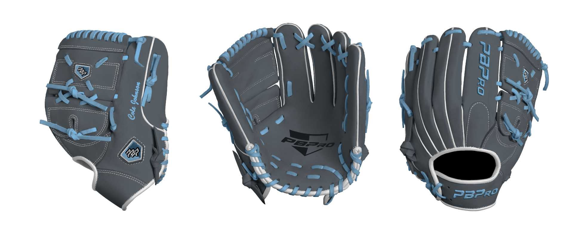 Category: PBPro Custom Product: Baseball Series: Travel Pro Series | USD 149.00 Glove Type: Fielders Size: 11.5" Finger Pad: With Finger Pad Web: Two Piece Web Palm: Palm (Color: Steel Gray) Back Shell Main: Back Shell Main (Color: Steel Gray) Back Shell Accent: Back Shell Accent (Color: Steel Gray) Web: Web (Color: Steel Gray) Finger Pad: Finger Pad (Color: Steel Gray) Welting: Welting (Color: White) Binding: Binding (Color: White) Lace: Lace (Color: Columbia Blue) Logo and Label: Logo and Label (Color: Columbia Blue) Stitch: Stitch (Color: White) Embroidery: Embroidery (Color: Columbia Blue) Hand Throw: Right Hand Thrower Lace Length: Normal Name: Cole Johnson (Font Style: Brush Script MT, Font Color: Columbia Blue, Patch Color: N/A) Flag (Ring Finger): N/A Remarks: N/A