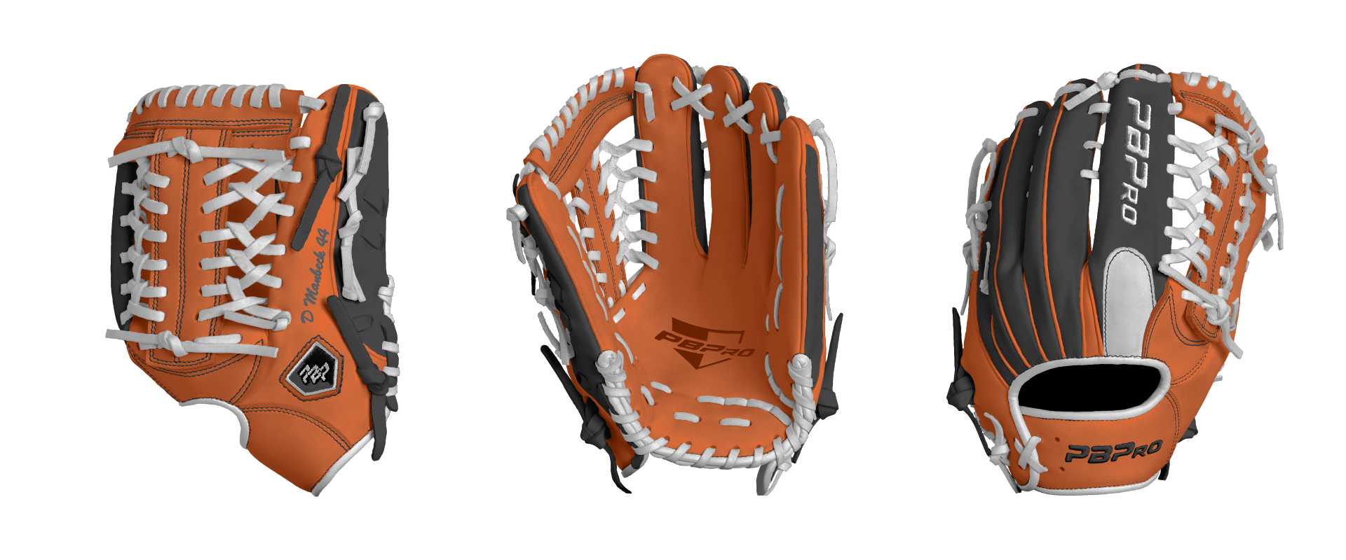 Category: PBPro Custom Product: Baseball Series: Travel Pro Series | USD 149.00 Glove Type: Fielders Size: 12.5" Finger Pad: With Finger Pad Web: Modified Trap Web Palm: Palm (Color: Orange) Back Shell Main: Back Shell Main (Color: Black) Back Shell Accent: Back Shell Accent (Color: Orange) Web: Web (Color: Orange) Finger Pad: Finger Pad (Color: White) Welting: Welting (Color: Orange) Binding: Binding (Color: White) Lace: Lace (Color: White) Logo and Label: Logo and Label (Color: Black) Stitch: Stitch (Color: Steel Gray) Embroidery: Embroidery (Color: White) Hand Throw: Right Hand Thrower Lace Length: Normal Name: D Manbeck 44 (Font Style: Brush Script MT, Font Color: Steel Gray, Patch Color: N/A) Flag (Ring Finger): N/A Remarks: N/A