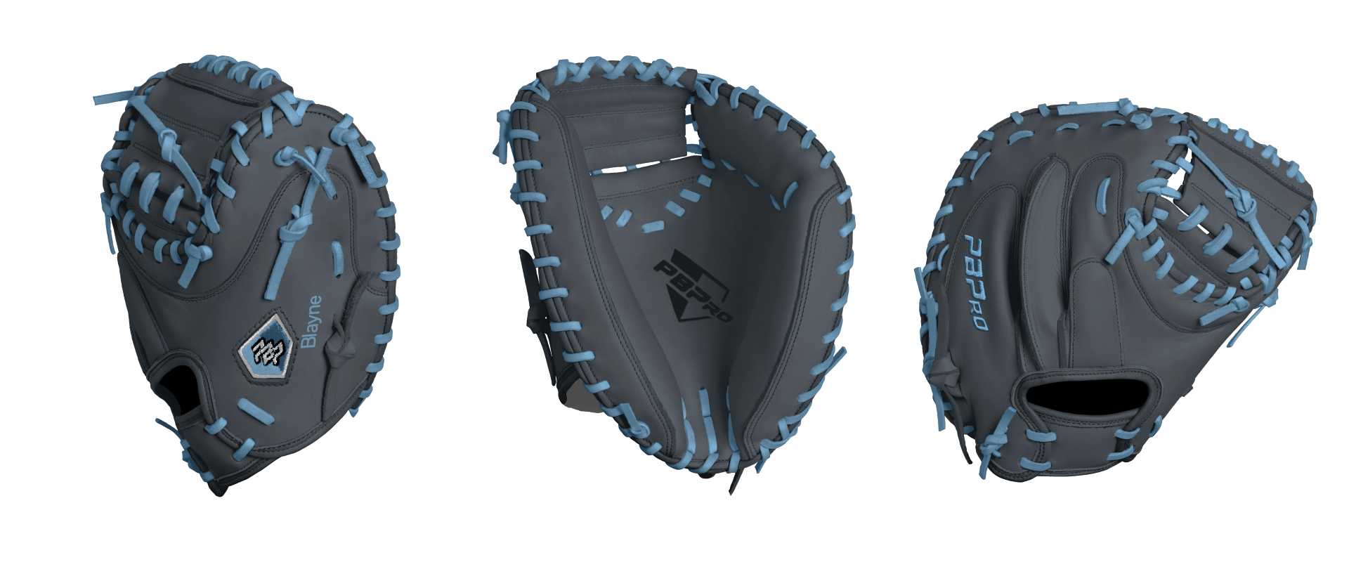 Category: PBPro Custom Product: Baseball Series: Travel Pro Series | USD 149.00 Glove Type: Mitts Size: 33" Catcher's Mitt Palm: Palm (Color: Steel Gray) Back Shell: Back Shell (Color: Steel Gray) Web: Web (Color: Steel Gray) Binding: Binding (Color: Steel Gray) Lace: Lace (Color: Columbia Blue) Logo: Logo (Color: Columbia Blue) Stitch: Stitch (Color: Steel Gray) Embroidery: Embroidery (Color: Columbia Blue) Hand Throw: Right Hand Thrower Lace Length: Normal Name: Blayne (Font Style: Pontano Sans, Font Color: Columbia Blue, Patch Color: N/A) Flag (Ring Finger): United States Remarks: N/A