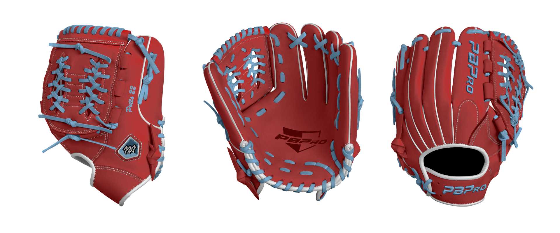 Category: PBPro Custom Product: Baseball Series: Travel Pro Series | USD 149.00 Glove Type: Fielders Size: 11.5" Finger Pad: With Finger Pad Web: Modified Basket Web Palm: Palm (Color: Red) Back Shell Main: Back Shell Main (Color: Red) Back Shell Accent: Back Shell Accent (Color: Red) Web: Web (Color: Red) Finger Pad: Finger Pad (Color: Red) Welting: Welting (Color: White) Binding: Binding (Color: White) Lace: Lace (Color: Columbia Blue) Logo and Label: Logo and Label (Color: Columbia Blue) Stitch: Stitch (Color: White) Embroidery: Embroidery (Color: Columbia Blue) Hand Throw: Right Hand Thrower Lace Length: Normal Name: Potts 22 (Font Style: Brush Script MT, Font Color: Columbia Blue, Patch Color: N/A) Flag (Ring Finger): N/A Remarks: N/A