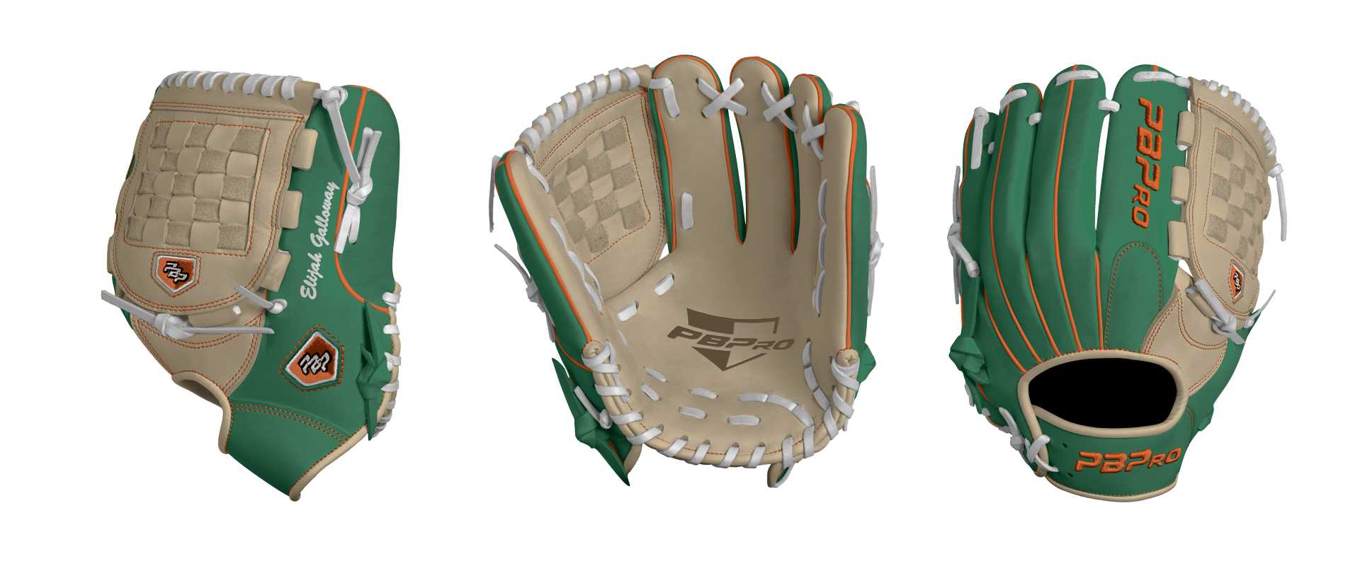 Category: PBPro Custom Product: Baseball Series: Travel Pro Series | USD 149.00 Glove Type: Fielders Size: 11.75" Finger Pad: With Finger Pad Web: Basket Web Palm: Palm (Color: Cream) Back Shell Main: Back Shell Main (Color: Green) Back Shell Accent: Back Shell Accent (Color: Green) Web: Web (Color: Cream) Finger Pad: Finger Pad (Color: Green) Welting: Welting (Color: Orange) Binding: Binding (Color: Cream) Lace: Lace (Color: White) Logo and Label: Logo and Label (Color: Orange) Stitch: Stitch (Color: Orange) Embroidery: Embroidery (Color: Orange) Hand Throw: Right Hand Thrower Lace Length: Normal Name: Elijah Galloway (Font Style: Brush Script MT, Font Color: White, Patch Color: N/A) Flag (Ring Finger): United States Remarks: N/A