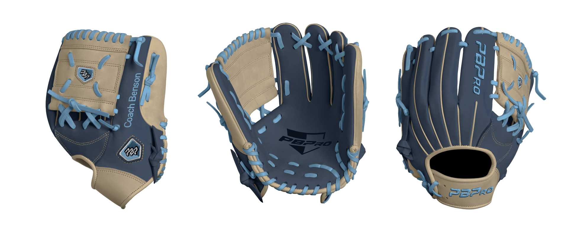Category: PBPro Custom Product: Baseball Series: Travel Pro Series | USD 149.00 Glove Type: Fielders Size: 11.25" Finger Pad: Without Finger Pad Web: One Piece Web Palm: Palm (Color: Navy) Back Shell Main: Back Shell Main (Color: Navy) Back Shell Accent: Back Shell Accent (Color: Cream) Web: Web (Color: Cream) Welting: Welting (Color: Cream) Binding: Binding (Color: Cream) Lace: Lace (Color: Columbia Blue) Logo and Label: Logo and Label (Color: Columbia Blue) Stitch: Stitch (Color: Cream) Embroidery: Embroidery (Color: Columbia Blue) Hand Throw: Right Hand Thrower Lace Length: Long (will not show in customizer) Name: Coach Benson (Font Style: Pontano Sans, Font Color: Columbia Blue, Patch Color: N/A) Flag (Ring Finger): N/A Remarks: N/A