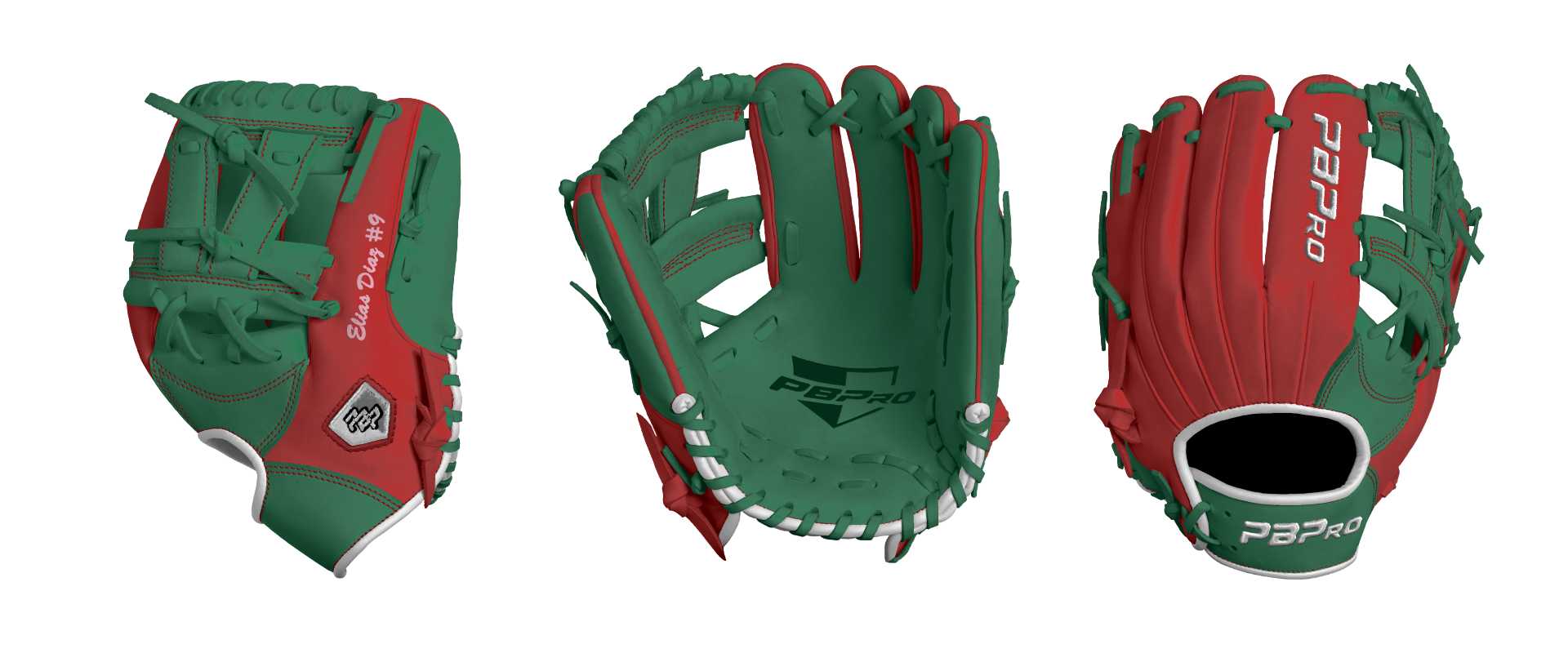 Category: PBPro Custom Product: Baseball Series: Travel Pro Series | USD 149.00 Glove Type: Fielders Size: 11.5" Finger Pad: Without Finger Pad Web: Pro V Web Palm: Palm (Color: Green) Back Shell Main: Back Shell Main (Color: Red) Back Shell Accent: Back Shell Accent (Color: Green) Web: Web (Color: Green) Welting: Welting (Color: Red) Binding: Binding (Color: White) Lace: Lace (Color: Green) Logo and Label: Logo and Label (Color: White) Stitch: Stitch (Color: Red) Embroidery: Embroidery (Color: White) Hand Throw: Right Hand Thrower Lace Length: Normal Name: Elias Diaz #9 (Font Style: Brush Script MT, Font Color: C.Pink, Patch Color: N/A) Flag (Ring Finger): Texas Remarks: Never give up
