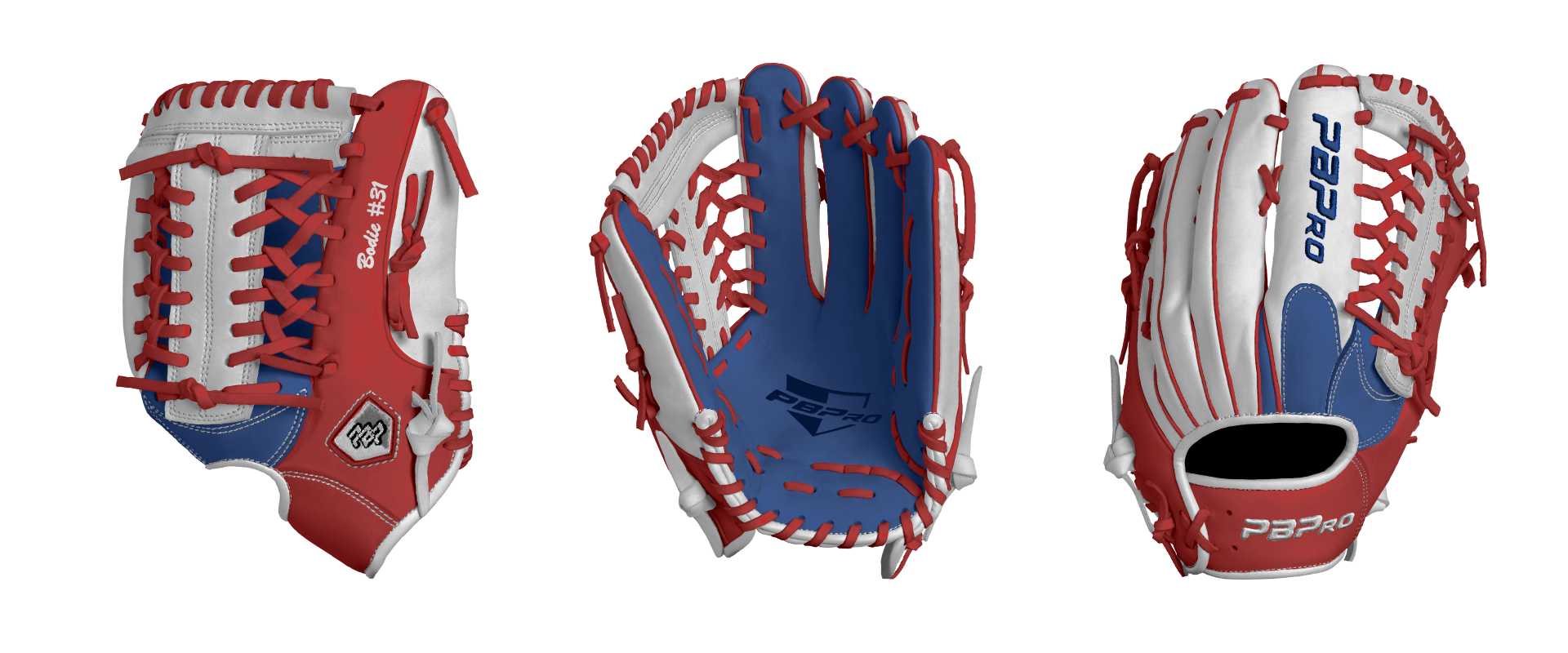 Category: PBPro Custom Product: Baseball Series: Travel Pro Series | USD 149.00 Glove Type: Fielders Size: 12.75" Finger Pad: With Finger Pad Web: Modified Trap Web Palm: Palm (Color: Royal) Back Shell Main: Back Shell Main (Color: White) Back Shell Accent: Back Shell Accent (Color: Red) Web: Web (Color: White) Finger Pad: Finger Pad (Color: Royal) Welting: Welting (Color: Red) Binding: Binding (Color: White) Lace: Lace (Color: Red) Logo and Label: Logo and Label (Color: White) Stitch: Stitch (Color: White) Embroidery: Embroidery (Color: Royal) Hand Throw: Right Hand Thrower Lace Length: Normal Name: Bodie #31 (Font Style: Brush Script MT, Font Color: White, Patch Color: N/A) Flag (Ring Finger): United States Remarks: N/A