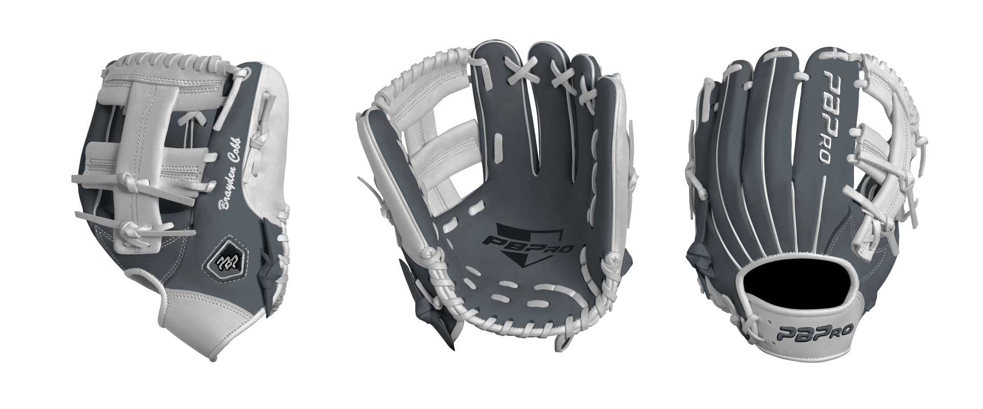 Category: PBPro Custom Product: Baseball Series: Travel Pro Series | USD 149.00 Glove Type: Fielders Size: 11.5" Finger Pad: Without Finger Pad Web: New Cross Web Palm: Palm (Color: Steel Gray) Back Shell Main: Back Shell Main (Color: Steel Gray) Back Shell Accent: Back Shell Accent (Color: White) Web: Web (Color: White) Welting: Welting (Color: White) Binding: Binding (Color: White) Lace: Lace (Color: White) Logo and Label: Logo and Label (Color: Steel Gray) Stitch: Stitch (Color: White) Embroidery: Embroidery (Color: White) Hand Throw: Right Hand Thrower Lace Length: Normal Name: Brayden Cobb (Font Style: Brush Script MT, Font Color: White, Patch Color: N/A) Flag (Ring Finger): N/A Remarks: N/A