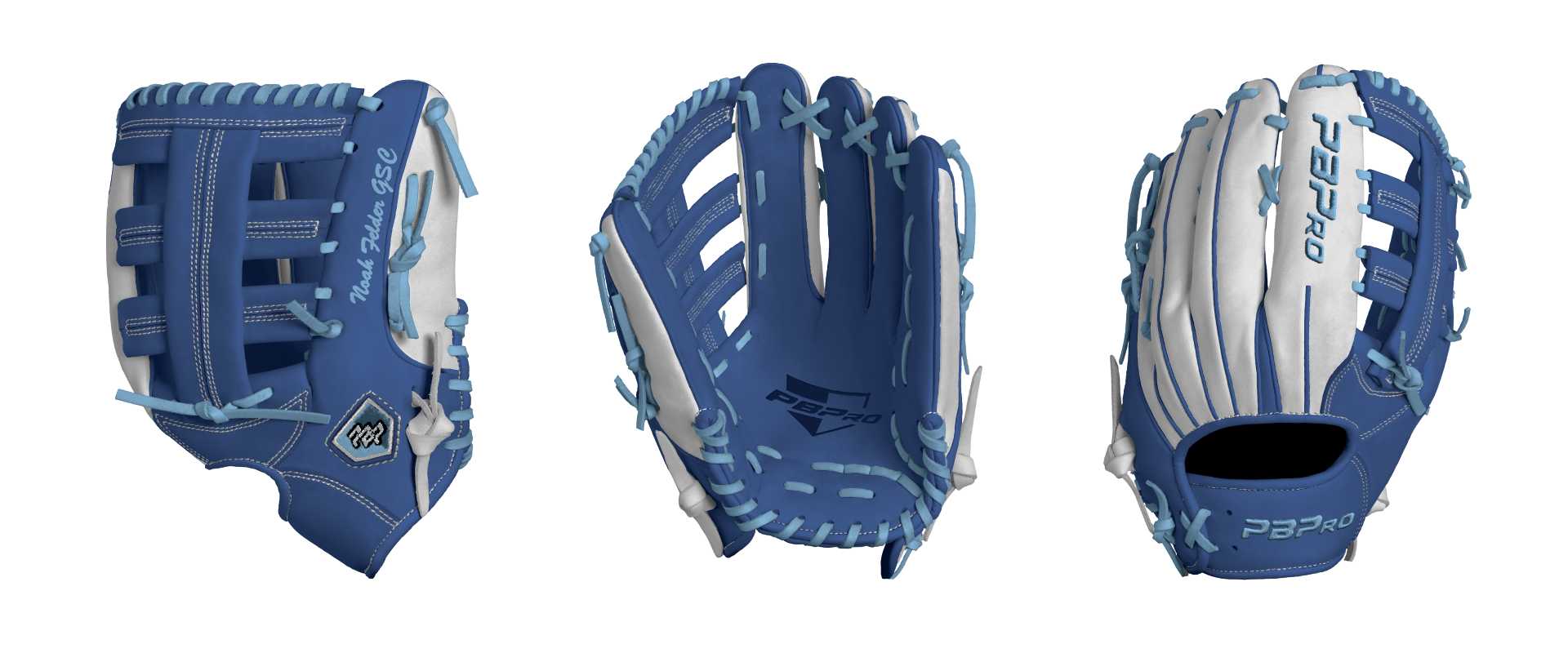 Category: PBPro Custom Product: Baseball Series: Travel Pro Series | USD 149.00 Glove Type: Fielders Size: 12.75" Finger Pad: Without Finger Pad Web: Double Bar Web Palm: Palm (Color: Royal) Back Shell Main: Back Shell Main (Color: White) Back Shell Accent: Back Shell Accent (Color: Royal) Web: Web (Color: Royal) Welting: Welting (Color: Royal) Binding: Binding (Color: Royal) Lace: Lace (Color: Columbia Blue) Logo and Label: Logo and Label (Color: Columbia Blue) Stitch: Stitch (Color: White) Embroidery: Embroidery (Color: Columbia Blue) Hand Throw: Right Hand Thrower Lace Length: Normal Name: Noah Felder GSC (Font Style: Brush Script MT, Font Color: Columbia Blue, Patch Color: N/A) Flag (Ring Finger): United States Remarks: N/A
