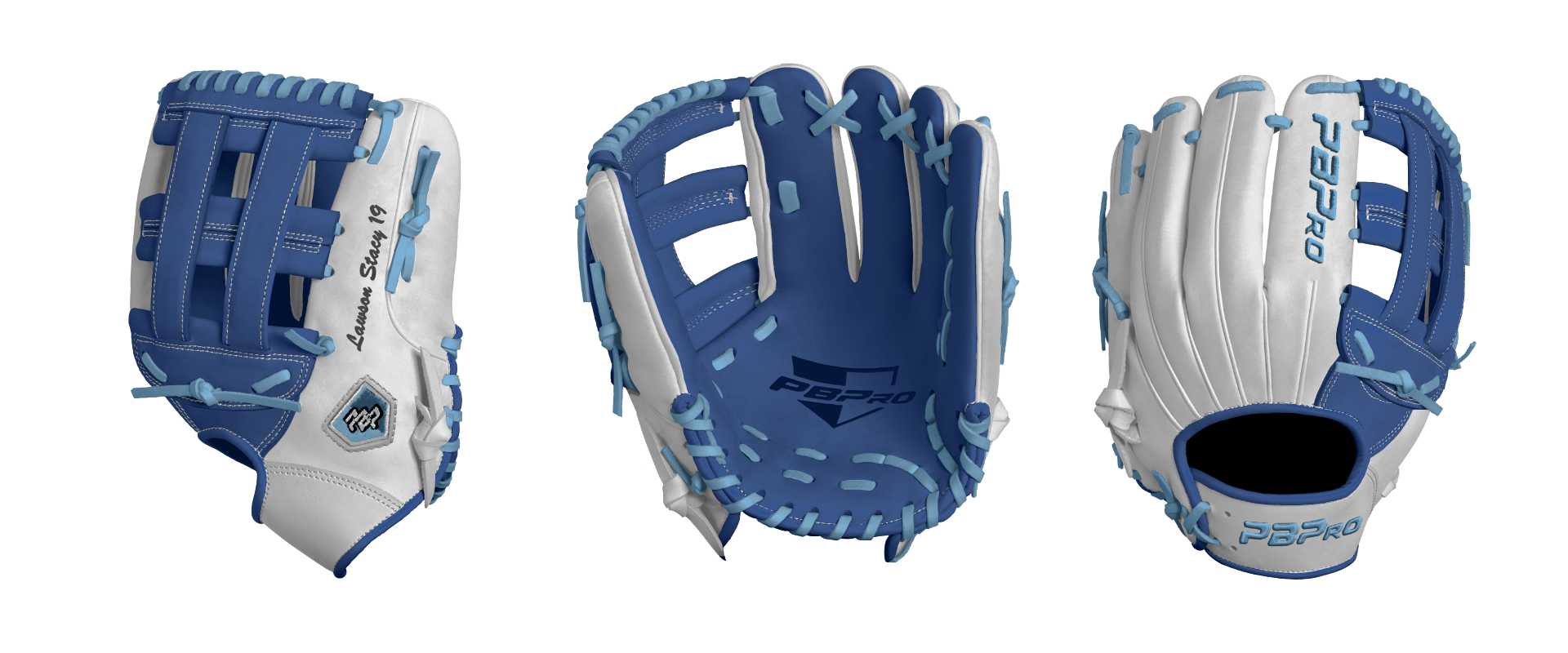 Category: PBPro Custom Product: Baseball Series: Travel Pro Series | USD 149.00 Glove Type: Fielders Size: 12.25" Finger Pad: Without Finger Pad Web: Pro H Web Palm: Palm (Color: Royal) Back Shell Main: Back Shell Main (Color: White) Back Shell Accent: Back Shell Accent (Color: White) Web: Web (Color: Royal) Welting: Welting (Color: White) Binding: Binding (Color: Royal) Lace: Lace (Color: Columbia Blue) Logo and Label: Logo and Label (Color: Columbia Blue) Stitch: Stitch (Color: White) Embroidery: Embroidery (Color: Columbia Blue) Hand Throw: Right Hand Thrower Lace Length: Normal Name: Lawson Stacy 19 (Font Style: Brush Script MT, Font Color: Black, Patch Color: N/A) Flag (Ring Finger): United States Remarks: N/A