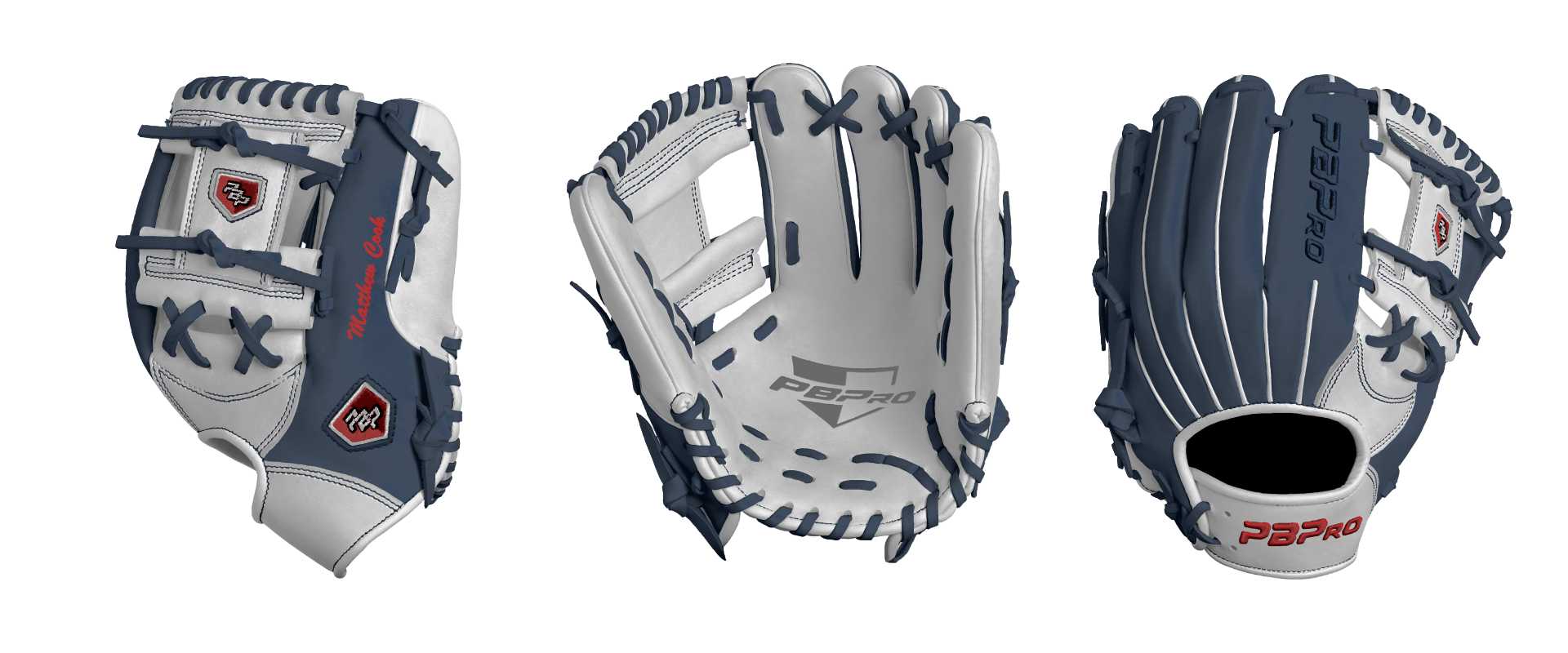 Category: PBPro Custom Product: Baseball Series: Travel Pro Series | USD 149.00 Glove Type: Fielders Size: 11.5" Finger Pad: Without Finger Pad Web: Pro I Web Palm: Palm (Color: White) Back Shell Main: Back Shell Main (Color: Navy) Back Shell Accent: Back Shell Accent (Color: White) Web: Web (Color: White) Welting: Welting (Color: White) Binding: Binding (Color: White) Lace: Lace (Color: Navy) Logo and Label: Logo and Label (Color: Red) Stitch: Stitch (Color: Navy) Embroidery: Embroidery (Color: Navy) Hand Throw: Right Hand Thrower Lace Length: Long (will not show in customizer) Name: Matthew Cook (Font Style: Brush Script MT, Font Color: Red, Patch Color: N/A) Flag (Ring Finger): United States Remarks: N/A