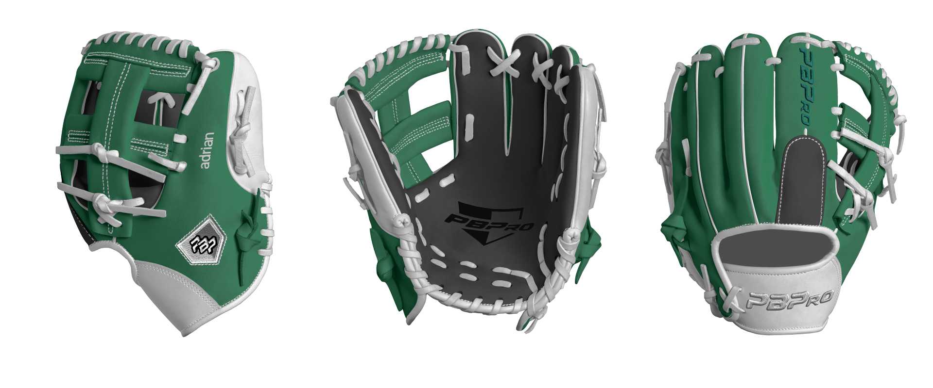Category: PBPro Custom Product: Baseball Series: Travel Pro Series | USD 149.00 Glove Type: Fielders Size: 11" Finger Pad: With Finger Pad Web: New Cross Web Palm: Palm (Color: Black) Back Shell Main: Back Shell Main (Color: Green) Back Shell Accent: Back Shell Accent (Color: White) Web: Web (Color: Green) Finger Pad: Finger Pad (Color: Black) Welting: Welting (Color: White) Binding: Binding (Color: White) Lace: Lace (Color: White) Logo and Label: Logo and Label (Color: White) Stitch: Stitch (Color: White) Embroidery: Embroidery (Color: Northwest Green) Hand Throw: Right Hand Thrower Lace Length: Normal Name: adrian (Font Style: Pontano Sans, Font Color: White, Patch Color: N/A) Flag (Ring Finger): N/A Remarks: N/A