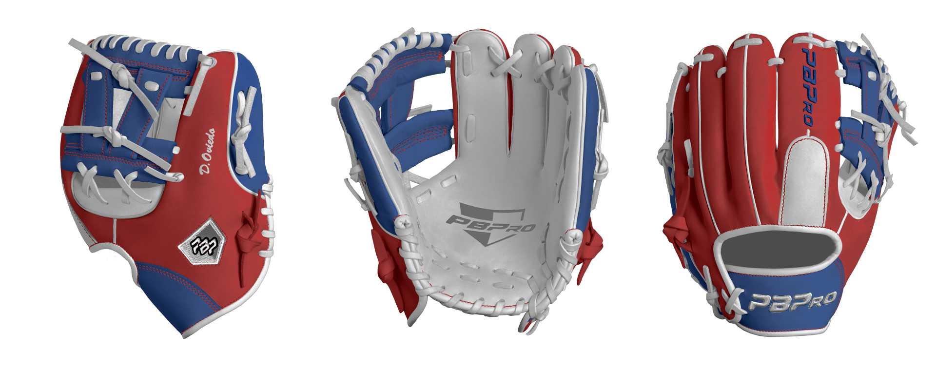 Category: PBPro Custom Product: Baseball Series: Travel Pro Series | USD 149.00 Glove Type: Fielders Size: 11" Finger Pad: With Finger Pad Web: Pro V Web Palm: Palm (Color: White) Back Shell Main: Back Shell Main (Color: Red) Back Shell Accent: Back Shell Accent (Color: Royal) Web: Web (Color: Royal) Finger Pad: Finger Pad (Color: White) Welting: Welting (Color: White) Binding: Binding (Color: White) Lace: Lace (Color: White) Logo and Label: Logo and Label (Color: White) Stitch: Stitch (Color: Red) Embroidery: Embroidery (Color: Royal) Hand Throw: Right Hand Thrower Lace Length: Normal Name: D.Oviedo (Font Style: Brush Script MT, Font Color: White, Patch Color: N/A) Flag (Ring Finger): Dominican Republic Remarks: N/A