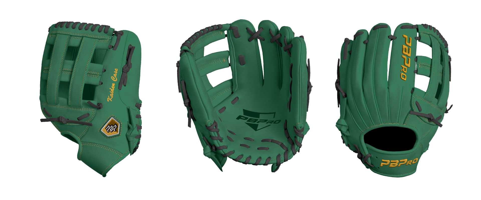 Category: PBPro Custom Product: Baseball Series: Travel Pro Series | USD 149.00 Glove Type: Fielders Size: 11.5" Finger Pad: Without Finger Pad Web: Pro H Web Palm: Palm (Color: Green) Back Shell Main: Back Shell Main (Color: Green) Back Shell Accent: Back Shell Accent (Color: Green) Web: Web (Color: Green) Welting: Welting (Color: Green) Binding: Binding (Color: Green) Lace: Lace (Color: Black) Logo and Label: Logo and Label (Color: G.Yellow) Stitch: Stitch (Color: Vegas Gold) Embroidery: Embroidery (Color: G.Yellow) Hand Throw: Right Hand Thrower Lace Length: Long (will not show in customizer) Name: Kaiden Case (Font Style: Brush Script MT, Font Color: G.Yellow, Patch Color: N/A) Flag (Ring Finger): United States Remarks: N/A