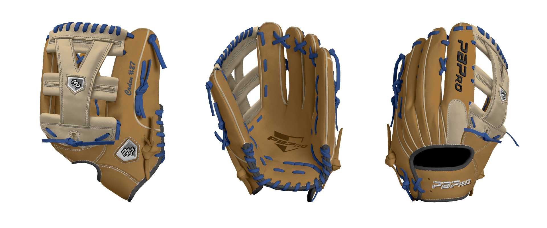 Category: PBPro Custom Product: Baseball Series: Travel Pro Series | USD 159.00 Glove Type: Fielders Size: 12.75" Finger Pad: With Finger Pad Web: Y Web Palm: Palm (Color: Tan) Back Shell Main: Back Shell Main (Color: Tan) Back Shell Accent: Back Shell Accent (Color: Tan) Web: Web (Color: Cream) Finger Pad: Finger Pad (Color: Cream) Welting: Welting (Color: Cream) Binding: Binding (Color: Black) Lace: Lace (Color: Royal) Logo and Label: Logo and Label (Color: White) Stitch: Stitch (Color: White) Embroidery: Embroidery (Color: Black) Hand Throw: Right Hand Thrower Lace Length: Normal Flex (will not show in customizer): Pro Flex: (Ideal for Pro Player who wants to have more control in forming the glove) Wrist Opening (will not show in customizer): Standard Wrist Name: Caden #27 (Font Style: Brush Script MT, Font Color: Navy, Patch Color: N/A) Flag (Ring Finger): N/A Remarks: N/A