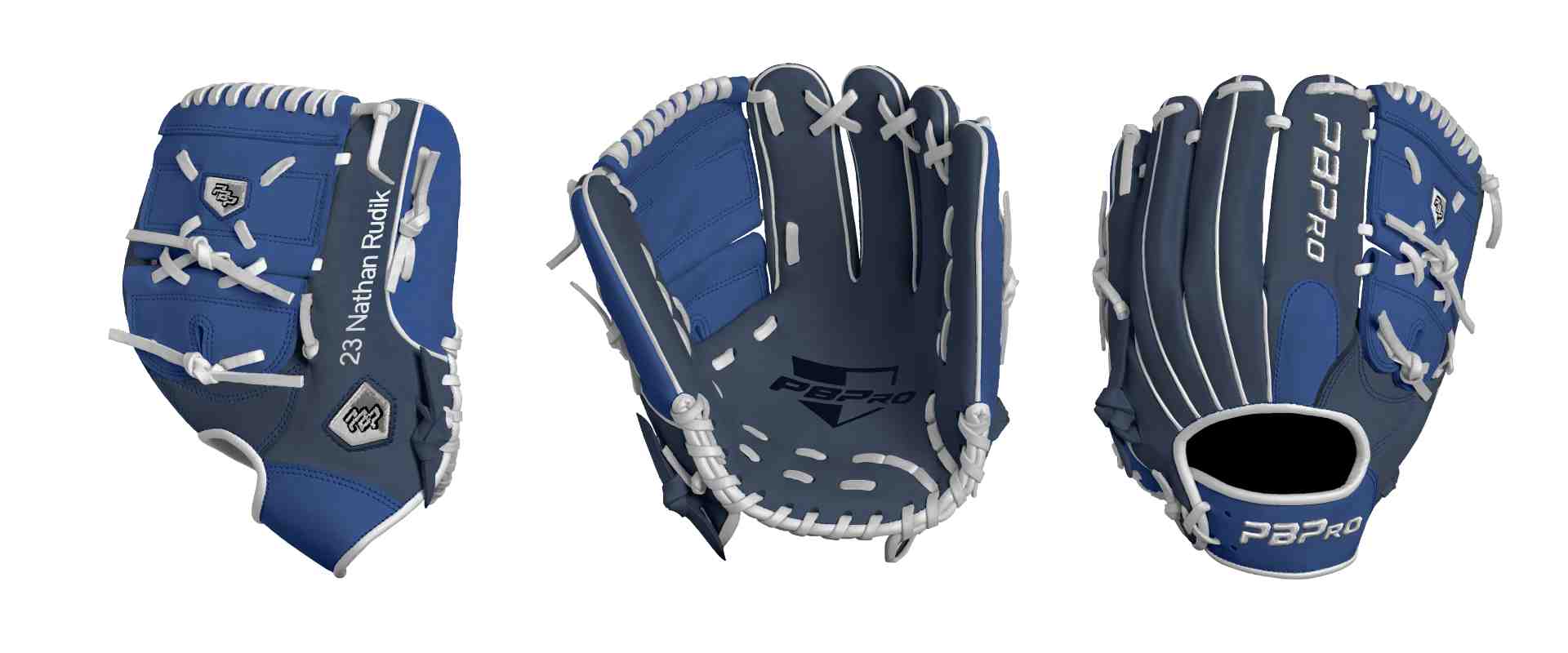 Category: PBPro Custom Product: Baseball Series: Travel Pro Series | USD 159.00 Glove Type: Fielders Size: 11.75" Finger Pad: With Finger Pad Web: Two Piece Web Palm: Palm (Color: Navy) Back Shell Main: Back Shell Main (Color: Navy) Back Shell Accent: Back Shell Accent (Color: Royal) Web: Web (Color: Royal) Finger Pad: Finger Pad (Color: Royal) Welting: Welting (Color: White) Binding: Binding (Color: White) Lace: Lace (Color: White) Logo and Label: Logo and Label (Color: White) Stitch: Stitch (Color: Royal) Embroidery: Embroidery (Color: White) Hand Throw: Right Hand Thrower Lace Length: Normal Flex (will not show in customizer): Standard Flex: ( Ideal for Youth Player. Glove still needs to break in) Wrist Opening (will not show in customizer): Standard Wrist Name: 23 Nathan Rudik (Font Style: Pontano Sans, Font Color: White, Patch Color: N/A) Flag (Ring Finger): United States Remarks: N/A