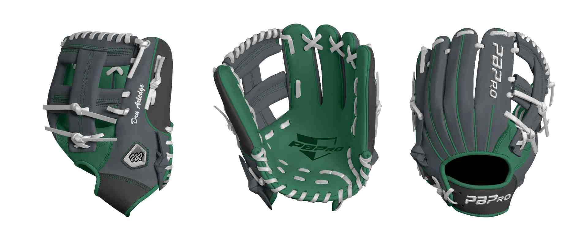 Category: PBPro Custom Product: Baseball Series: Travel Pro Series | USD 159.00 Glove Type: Fielders Size: 11.75" Finger Pad: Without Finger Pad Web: New Cross Web Palm: Palm (Color: Green) Back Shell Main: Back Shell Main (Color: Steel Gray) Back Shell Accent: Back Shell Accent (Color: Black) Web: Web (Color: Steel Gray) Welting: Welting (Color: Green) Binding: Binding (Color: Green) Lace: Lace (Color: White) Logo and Label: Logo and Label (Color: White) Stitch: Stitch (Color: Green) Embroidery: Embroidery (Color: White) Hand Throw: Left Hand Thrower Lace Length: Normal Flex (will not show in customizer): Standard Flex: ( Ideal for Youth Player. Glove still needs to break in) Wrist Opening (will not show in customizer): Standard Wrist Name: Dru Arledge (Font Style: Brush Script MT, Font Color: White, Patch Color: N/A) Flag (Ring Finger): United States Remarks: N/A