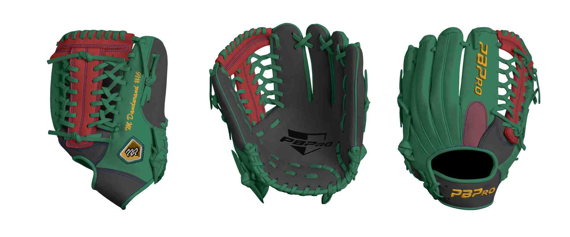Category: PBPro Custom Product: Baseball Series: Travel Pro Series | USD 159.00 Glove Type: Fielders Size: 11.5" Finger Pad: With Finger Pad Web: Modified Trap Web Palm: Palm (Color: Black) Back Shell Main: Back Shell Main (Color: Green) Back Shell Accent: Back Shell Accent (Color: Black) Web: Web (Color: Red) Finger Pad: Finger Pad (Color: Maroon) Welting: Welting (Color: Green) Binding: Binding (Color: Green) Lace: Lace (Color: Green) Logo and Label: Logo and Label (Color: G.Yellow) Stitch: Stitch (Color: Royal) Embroidery: Embroidery (Color: G.Yellow) Hand Throw: Left Hand Thrower Lace Length: Long (will not show in customizer) Flex (will not show in customizer): Standard Flex: ( Ideal for Youth Player. Glove still needs to break in) Wrist Opening (will not show in customizer): Standard Wrist Name: M Dandurand #16 (Font Style: Brush Script MT, Font Color: G.Yellow, Patch Color: N/A) Flag (Ring Finger): California Remarks: N/A