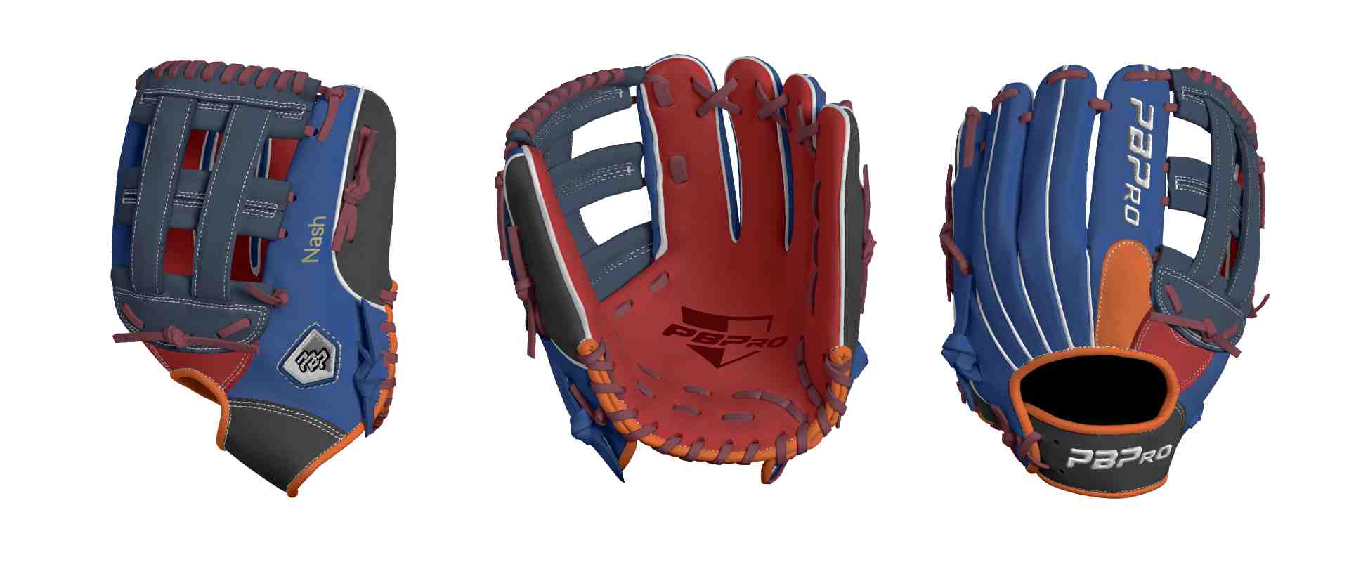Category: PBPro Custom Product: Baseball Series: Travel Pro Series | USD 159.00 Glove Type: Fielders Size: 11.5" Finger Pad: With Finger Pad Web: Pro H Web Palm: Palm (Color: Red) Back Shell Main: Back Shell Main (Color: Royal) Back Shell Accent: Back Shell Accent (Color: Black) Web: Web (Color: Navy) Finger Pad: Finger Pad (Color: Orange) Welting: Welting (Color: White) Binding: Binding (Color: Orange) Lace: Lace (Color: Maroon) Logo and Label: Logo and Label (Color: White) Stitch: Stitch (Color: White) Embroidery: Embroidery (Color: White) Hand Throw: Right Hand Thrower Lace Length: Normal Flex (will not show in customizer): Standard Flex: ( Ideal for Youth Player. Glove still needs to break in) Wrist Opening (will not show in customizer): Standard Wrist Name: Nash (Font Style: Pontano Sans, Font Color: Vegas Gold, Patch Color: N/A) Flag (Ring Finger): United States Remarks: N/A